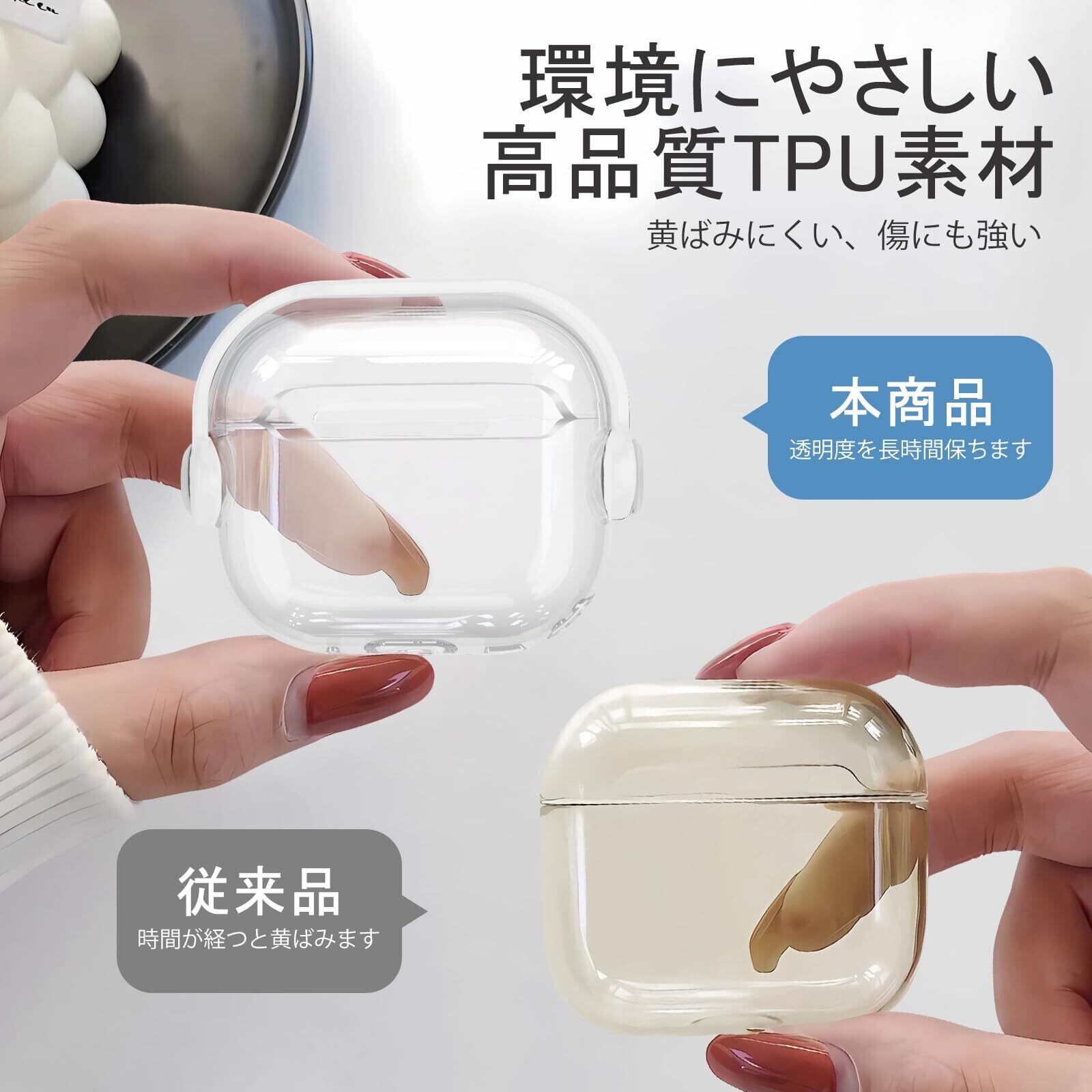 2.【高品質素材】AirPods4専用のクリアケースです。黄変防止の高品質TPU素材を使用しており、環境にやさしく、手触りが良くて耐久性にも優れています。また、カラフルな縁とクリアな表面で、ケースを装着した状態でもAirPods4本体が見えるため、おしゃれです。