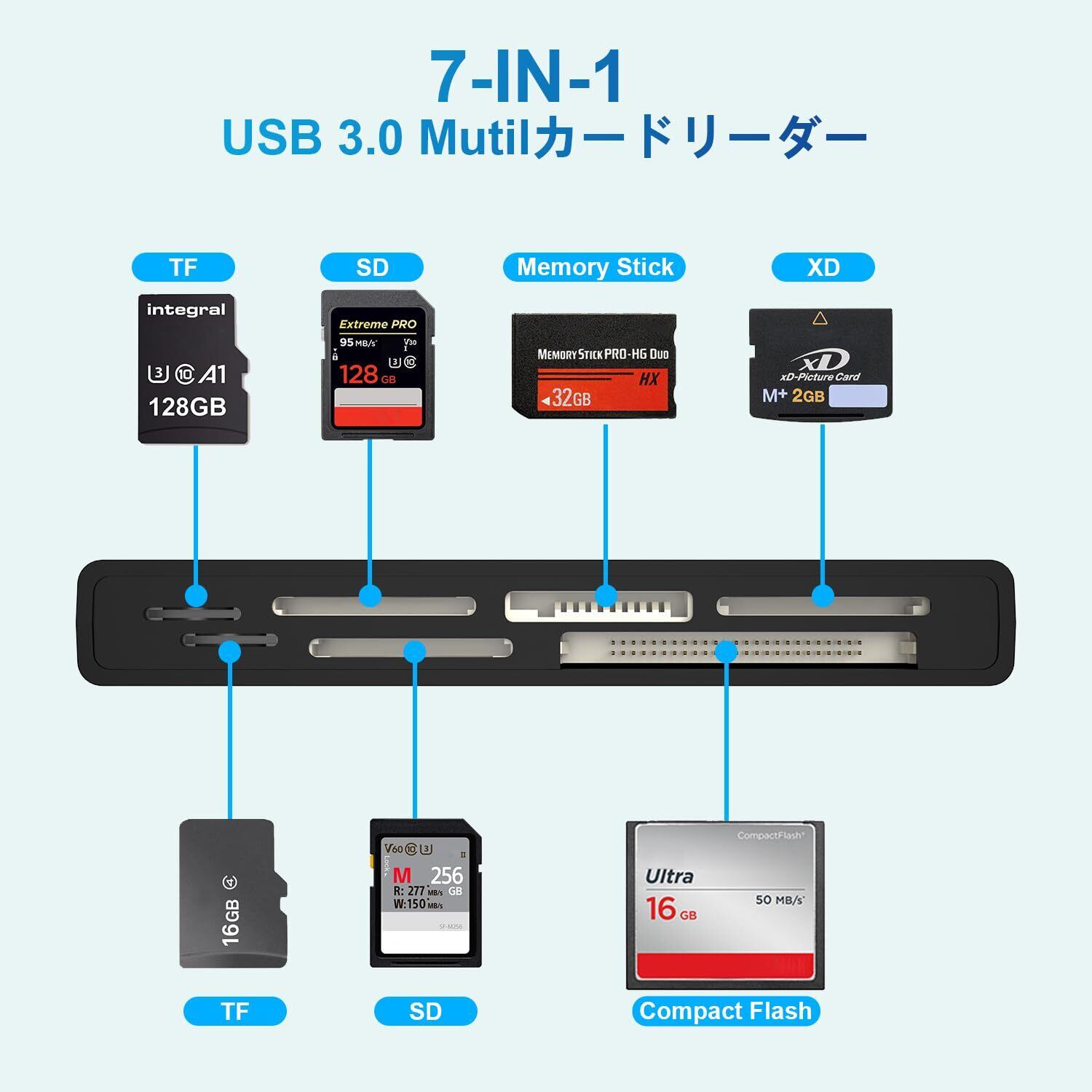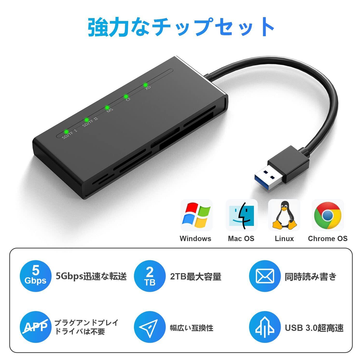 USB3.0 マルチ SD カードリーダー、SD/TF/マイクロSD/CF/MS/XD 7in1 5Gbps高速 usb3.0 メモリーカードリーダー SD SDXC SDHC TF マイクロSD CF MS MMCカード、ソニー メモリースティック duo アダプター 5カード同時読込可能