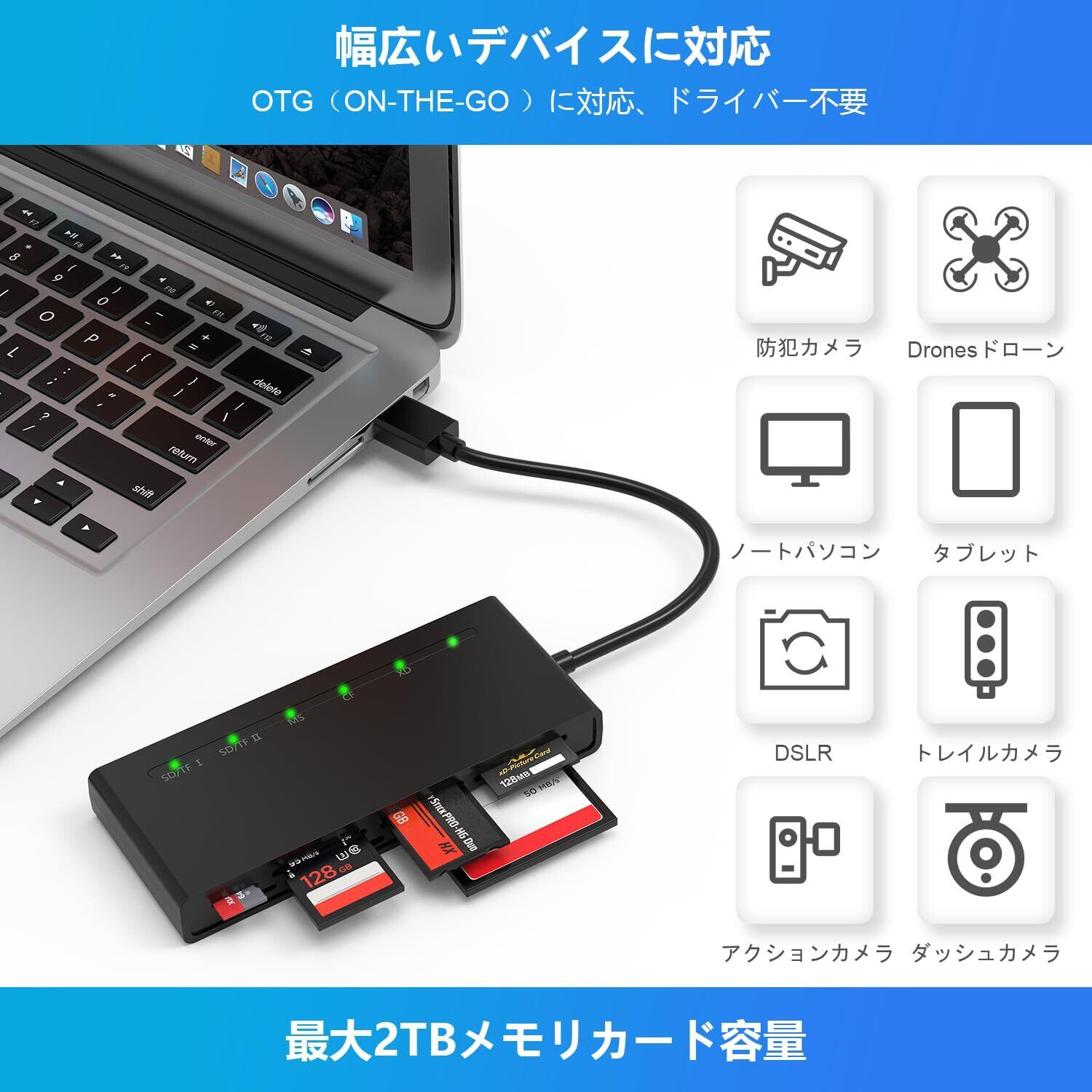 メディアタイプ MicroSD, MMC, CF, RS-MMC, メモリースティック, MS, MiniSD, SDカード, TFカード, SDXC, SDHC, xDピクチャーカード
