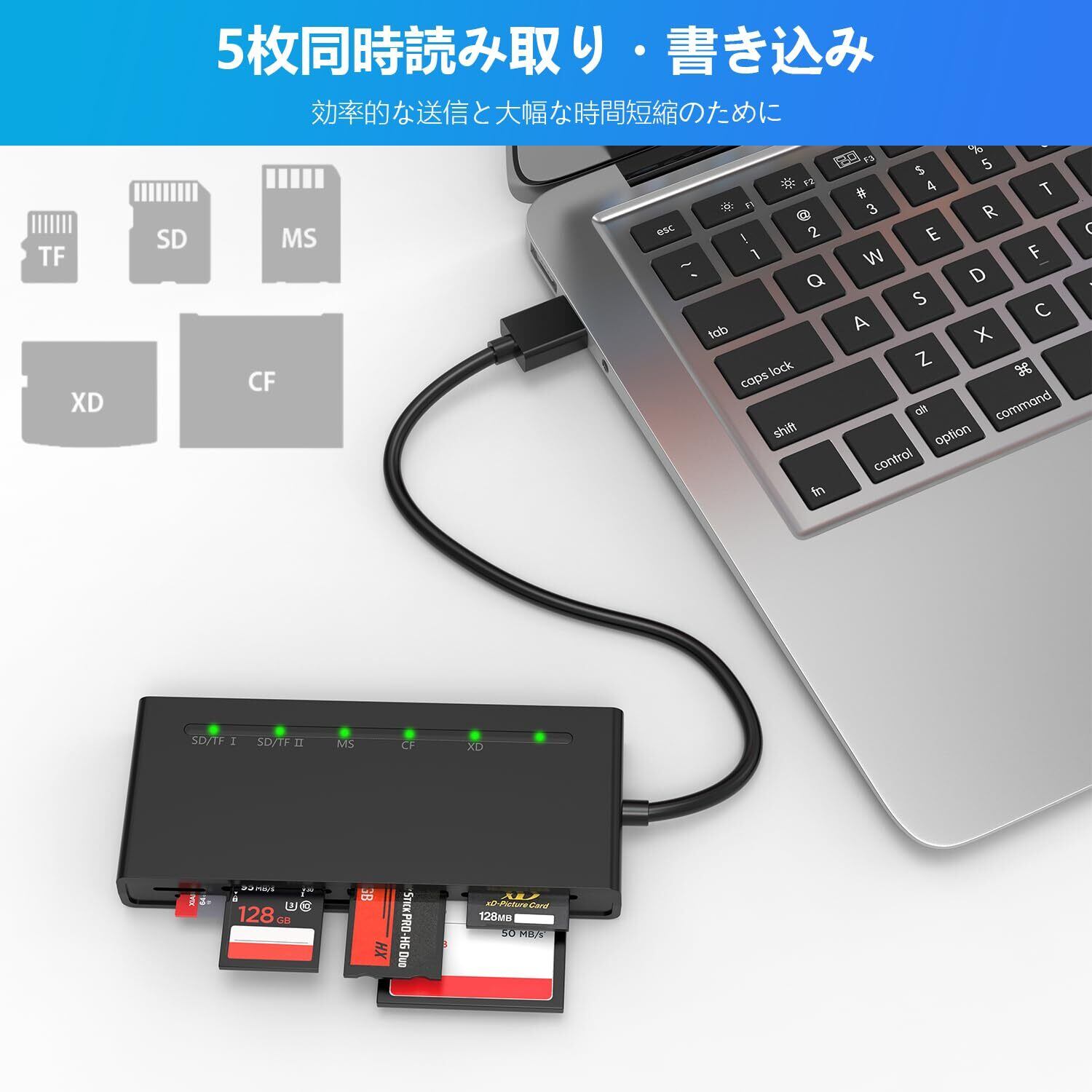[7in1 USB メモリーカードリーダー]このメモリースティック duoは、1*CFスロット、2*SD、2*TF(マイクロSD)、1*MS、1*XDカードスロットを備えています。さらに、このsd カードリーダーは5種類のカードを同時に読み書きすることができ、作業効率を大幅に向上させることができます。
