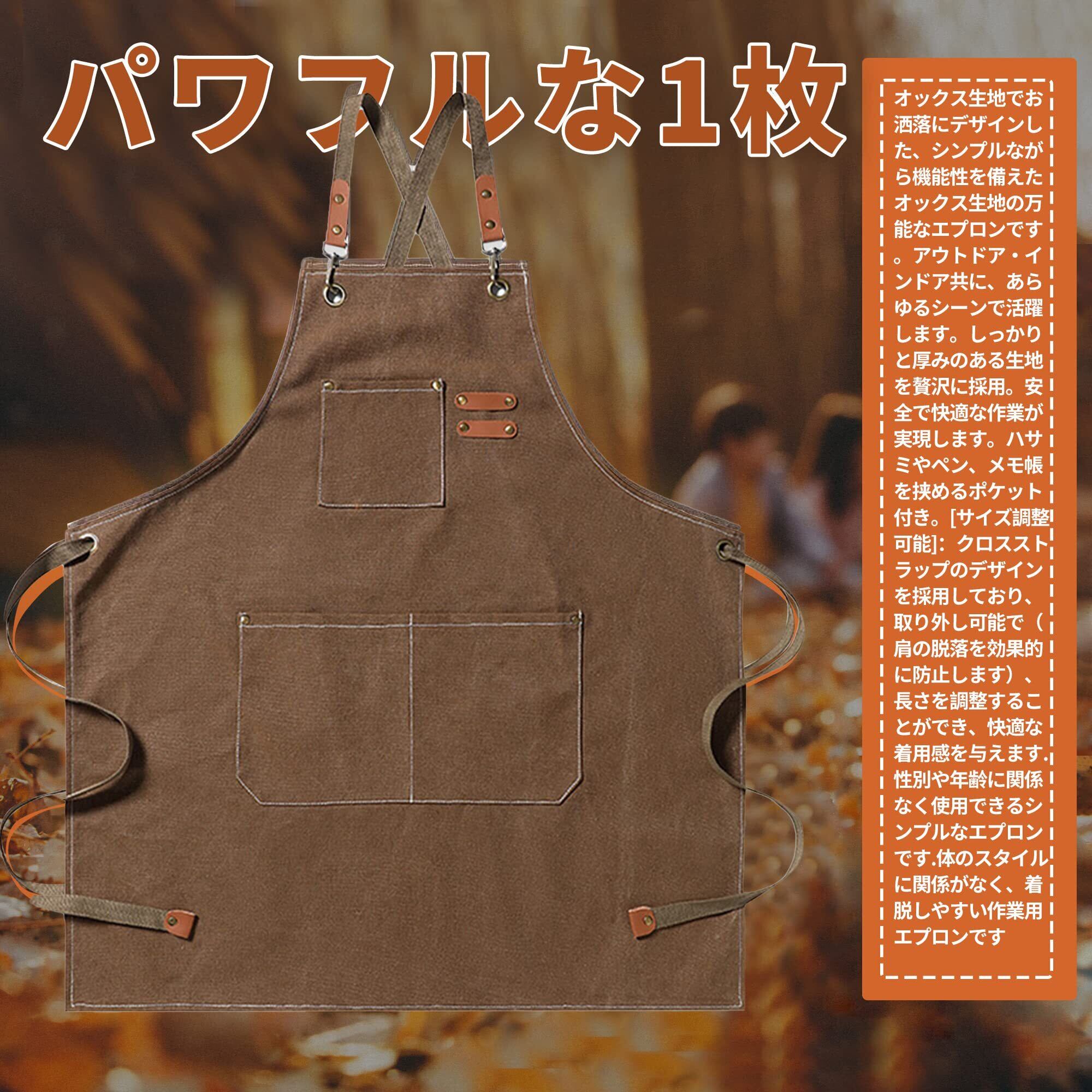 【パワフルな1枚】オックス生地でお洒落にデザインした、シンプルながら機能性を備えたオックス生地の万能なエプロンです。アウトドア・インドア共に、あらゆるシーンで活躍します。しっかりと厚みのある生地を贅沢に採用。安全で快適な作業が実現します。ハサミやペン、メモ帳を挟めるポケット付き。[サイズ調整可能]:クロスストラップのデザインを採用しており、取り外し可能で(肩の脱落を効果的に防止します)、長さを調整することができ、快適な着用感を与えます.性別や年齢に関係なく使用できるシンプルなエプロンです.体のスタイルに関係がなく、着脱しやすい作業用エプロンです
