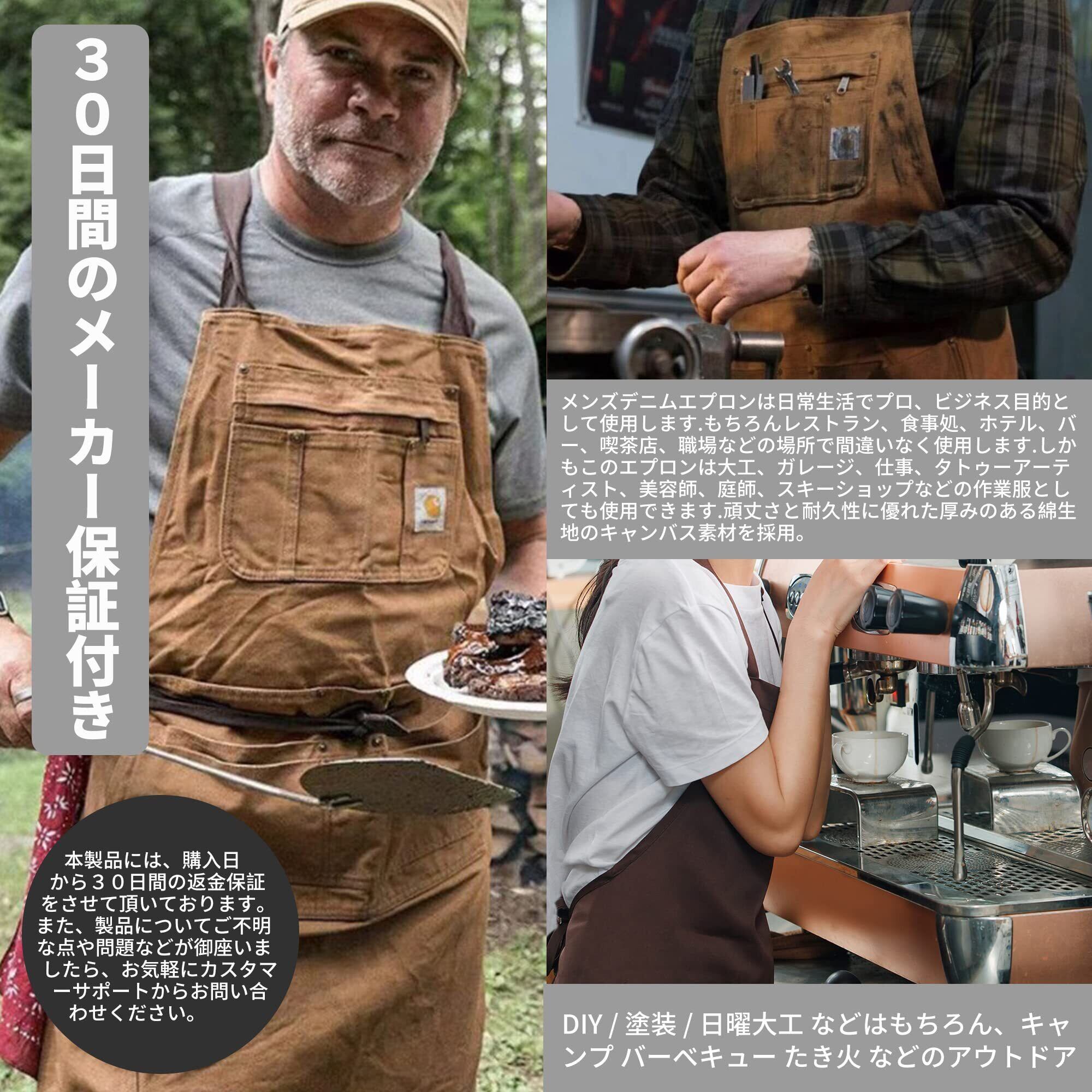 【簡単お手入れ】ご自宅で洗濯が可能です。(シワや色落ちのため過度な洗濯や脱水等にはご注意ください) 取り外し簡単なカラビナ付きのヒモは洗濯や持ち運びにも便利です。安全性を高めるため丈の長いデザインです。アウトドア ガーデニング でのお庭仕事カフェ・シェフ・バリスタ・パン屋さん・美容院 理髪・木工作業など様々なお仕事で実用性を発揮します。[快適なストラップ]:ストラップは首の周りではなく肩の上にあり、首の痛みを防ぐために重量をより良く分散します。 この仕事エプロンを着て快適さを感じるでしょう。