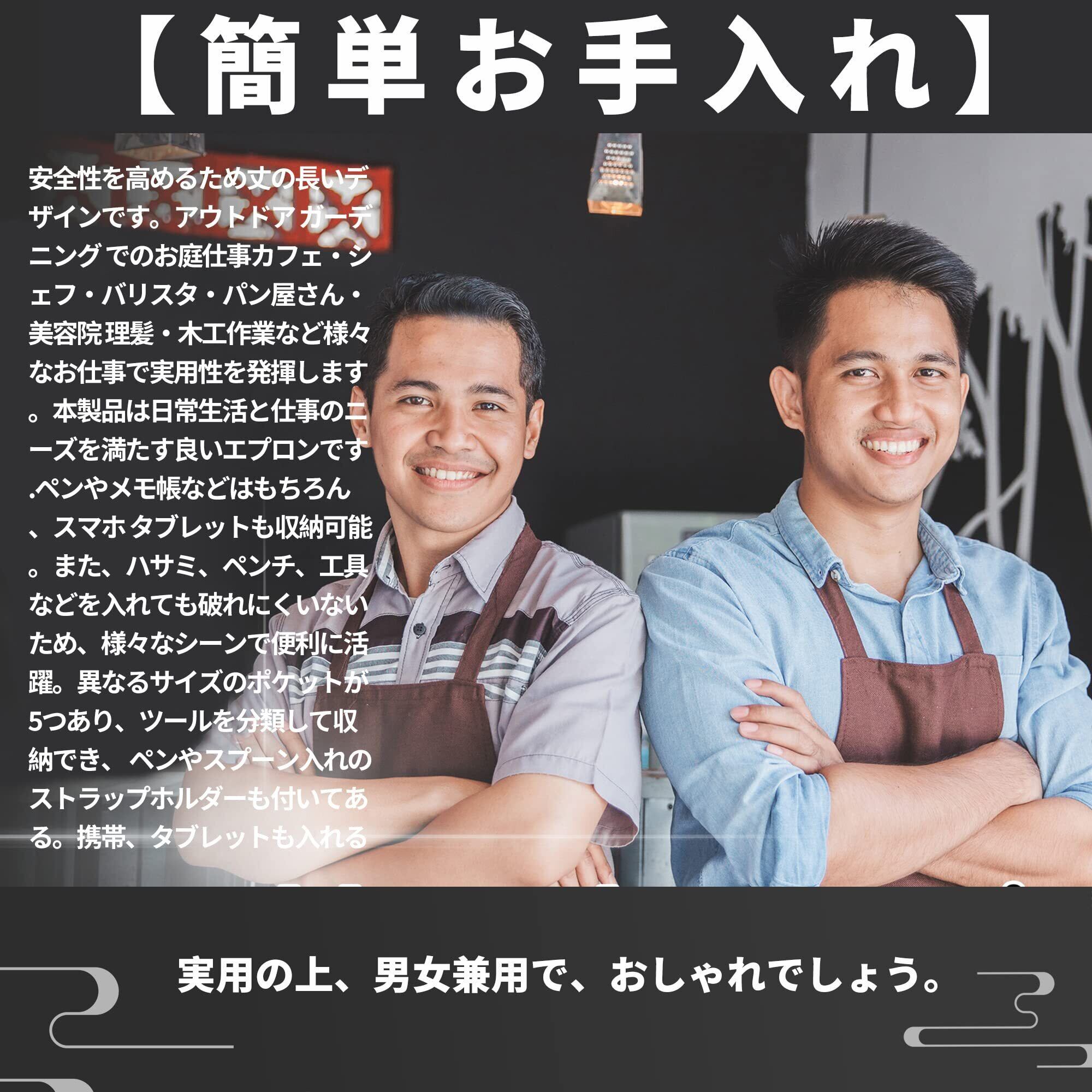 [多機能ポケット]:ポケット付きの多機能エプロンは、実用的でスタイリッシュなデザインを採用しております.ポケットにガジェットを収納することに使用でき、エプロンにハサミやペン、スマートフォンやメモ帳を入れることができ、及びお必要な様々な実用なツールも入れることができます.本製品は日常生活と仕事のニーズを満たす良いエプロンです.ペンやメモ帳などはもちろん、スマホ タブレットも収納可能。また、ハサミ、ペンチ、工具などを入れても破れにくいないため、様々なシーンで便利に活躍。異なるサイズのポケットが5つあり、ツールを分類して収納でき、 ペンやスプーン入れのストラップホルダーも付いてある。携帯、タブレットも入れる。実用の上、男女兼用で、おしゃれでしょう。
