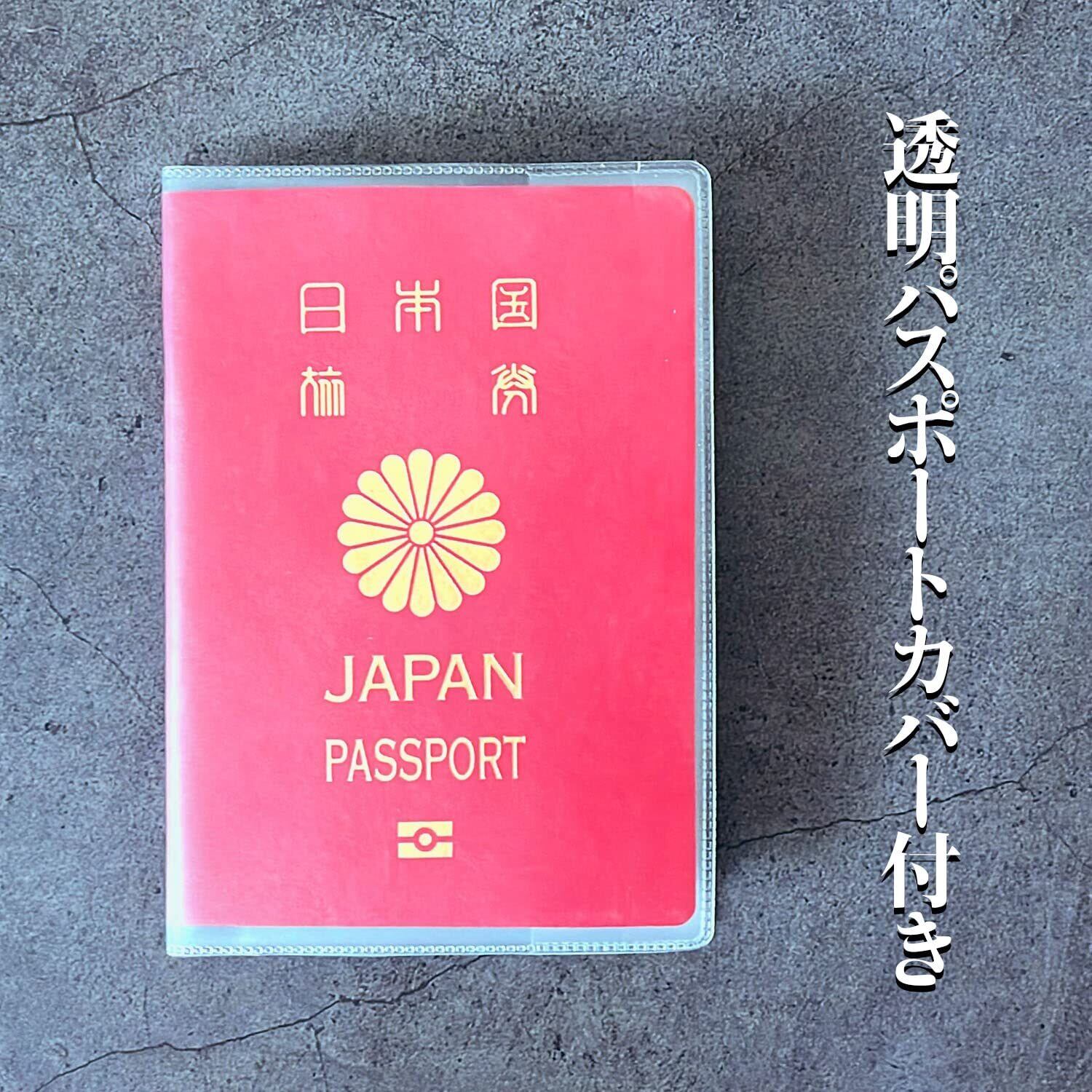 【シンプルなデザイン】見た目もオシャレなゴムバンド。バッグの中でパスポートケースが開くのを防ぎます。パスポートをキズや汚れから守るクリアケースが付属しています