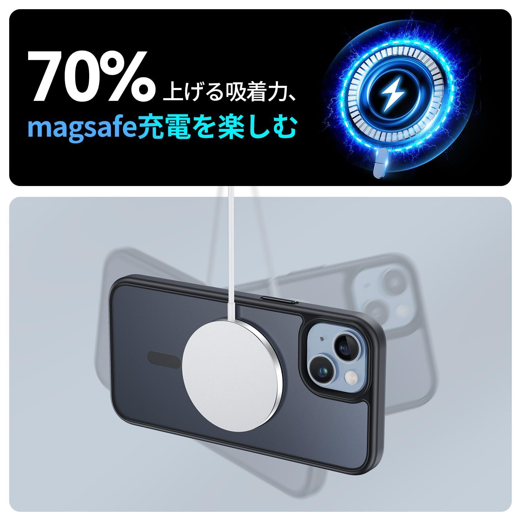 【強力な磁力吸着・高速充電体験】強力なマグネット搭載で差し込みのいらない超簡単充電を実現しました。マグネットによる正確な位置合わせで、ワイヤレス充電がこれまでよりもすばやく簡単に完了します。iPhoneを充電する時は、ケースを装着したままMagSafe充電器に取り付けるか、Qi規格の充電器の上に置くだけです。