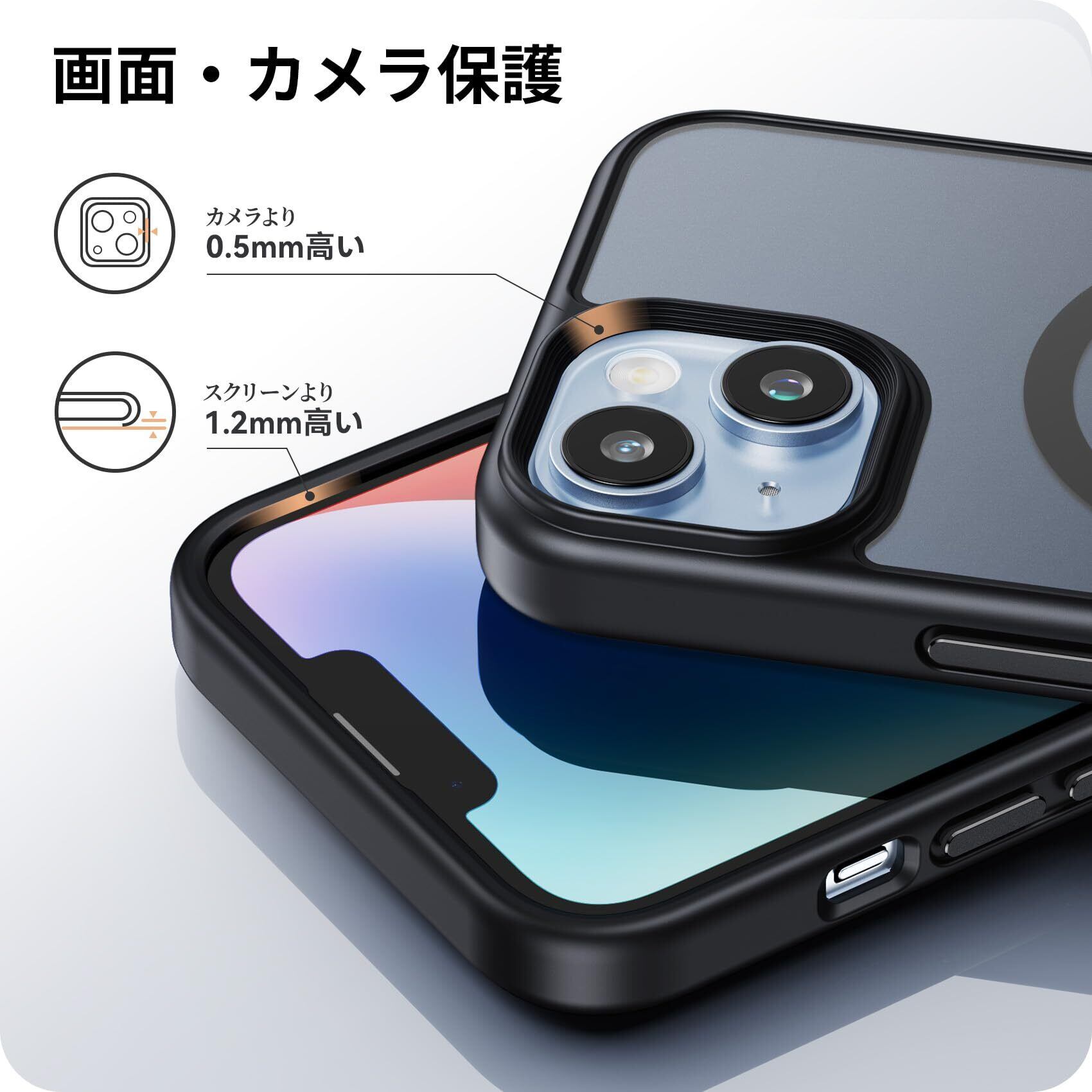 【細部までも保護】カバーの縁はアイフォン14 /13 の液晶画面より1mm高く、カメラレンズより0.7mm高い、併用の保護ガラスフィルムで平置きしても画面は接触しない、細部までの保護も配慮され、より一層な安心感を与えられます。