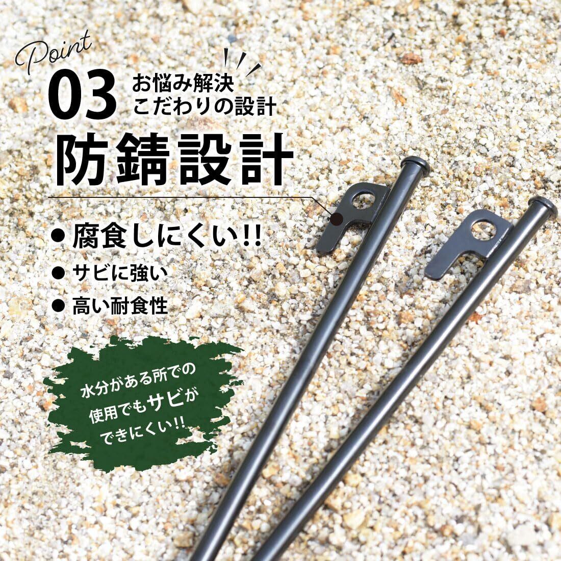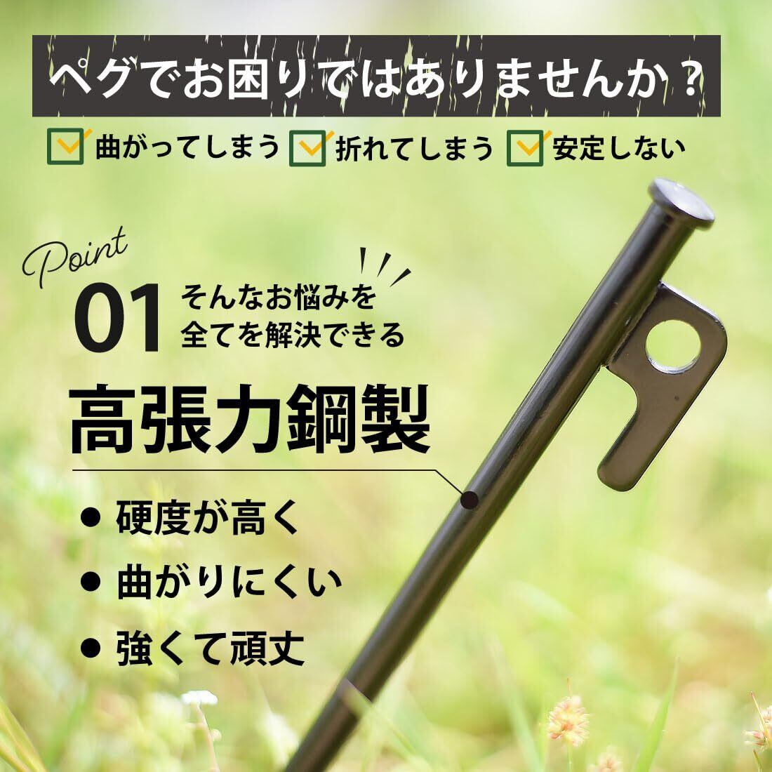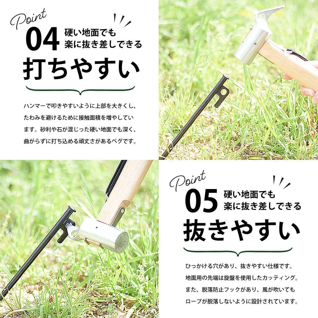 【頑丈なペグ】砂利や石混じりの硬い地面でも、強く深く打ち込める強靭なペグです。
