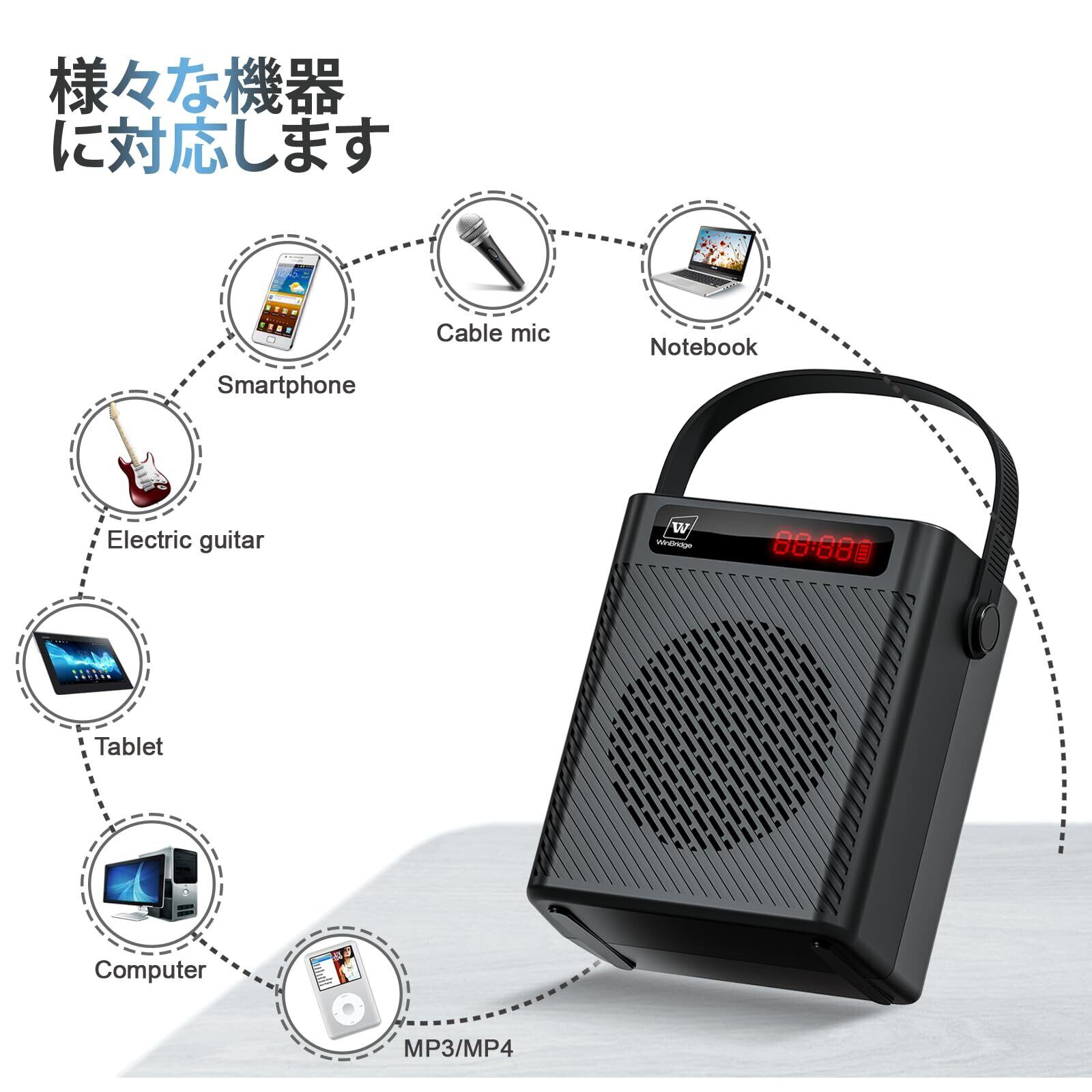 マイク付きスピーカー:音楽の転送と製御が簡単です。USBドライブ、TFカードまたはMP3プレーヤーによる音楽再生に対応。拡声と再生の同期に対応しています。また、内蔵する録音機能もあり、重要な時刻をいつでもどこでも記録します。