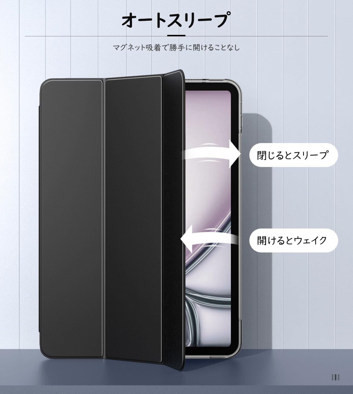 「オートスリープ機能」マグネット内蔵で、自動オートスリープと自動ウェイクアップの機能がついており、ケースの開閉より自動的に電源オン・オフになります。省エネでとても便利な仕様となります。