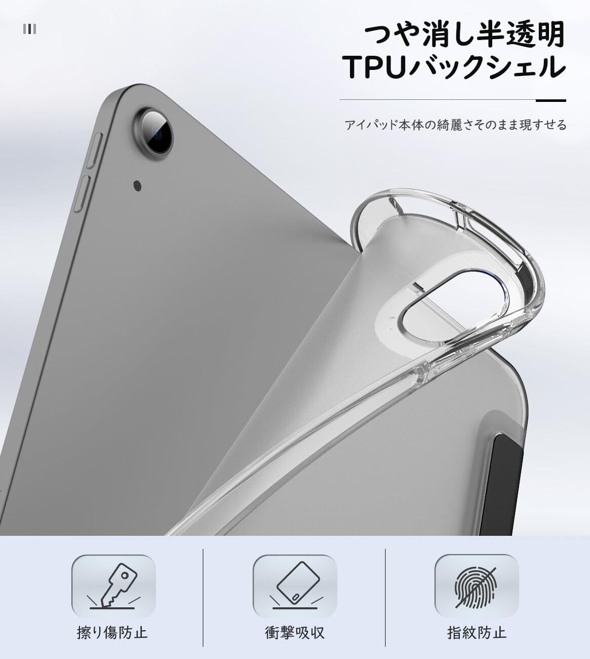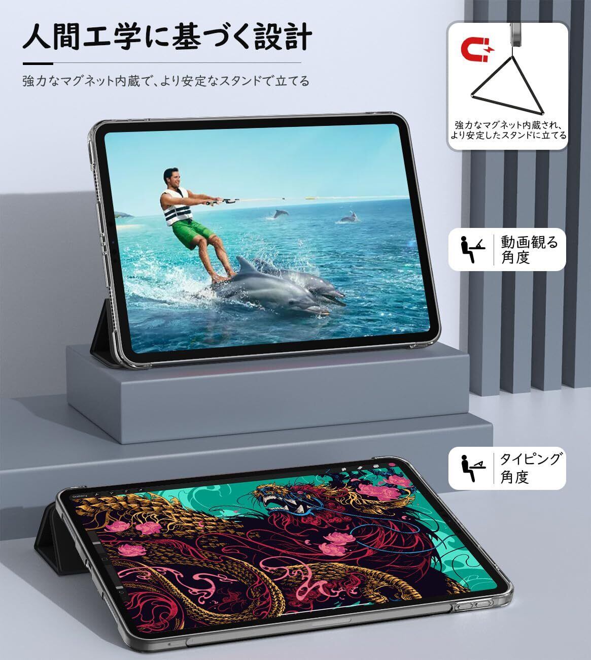 「ケース装着のまま各操作可」精密な打ち抜きで機械にぴったりフィットできます。ケースを着装したままで電源ボタンや充電など全ての機能を操作できて、サイドカバーなしの仕様より、カバー外さなくてもiPad Air 11インチ: ApplePencil Proワイヤレス充電対応で、iPad Air 第5世代/第4世代 10.9インチ: ApplePencil第2世代ワイヤレス充電対応します。(ApplePencilUSB-Cは磁性取付のみ対応)