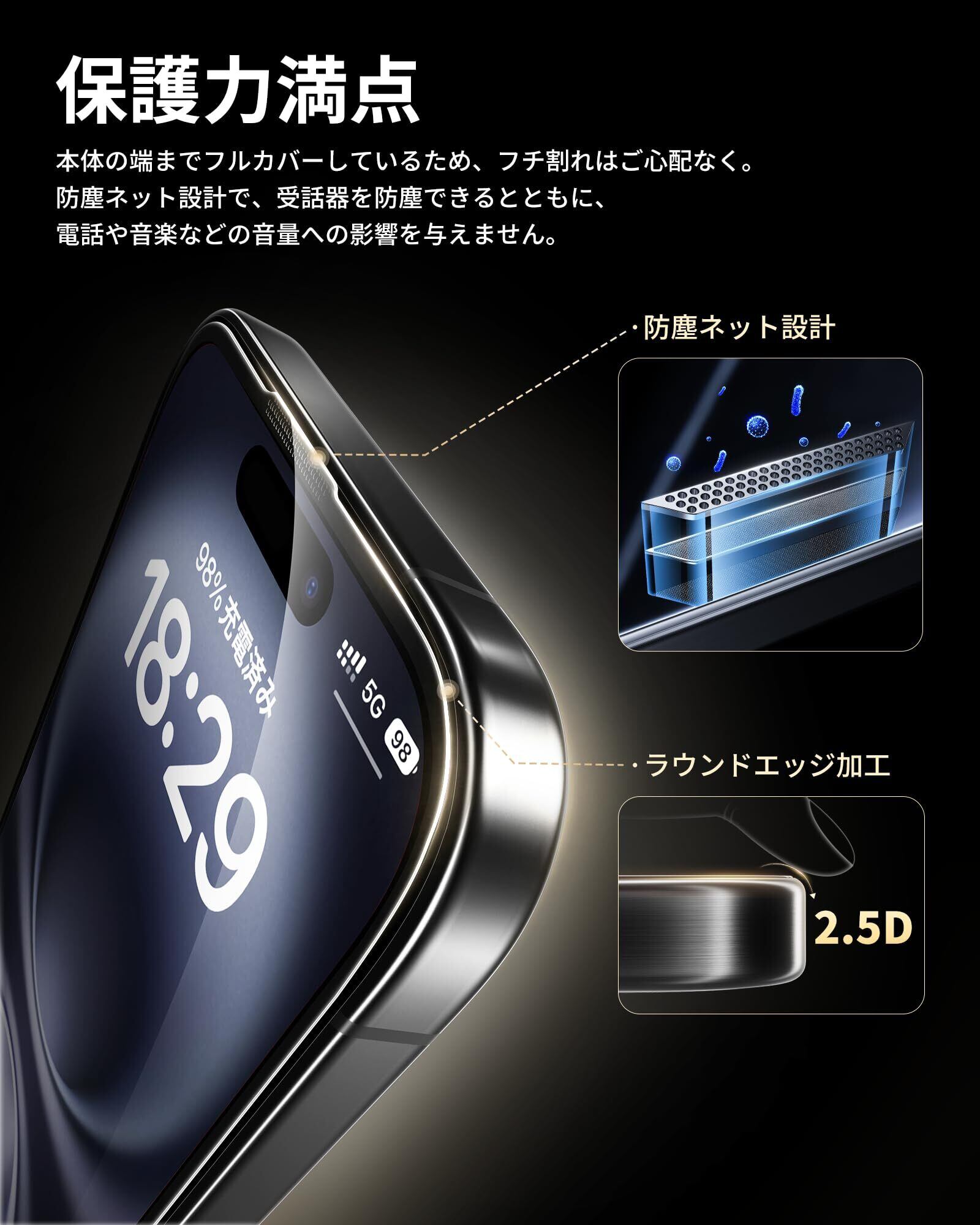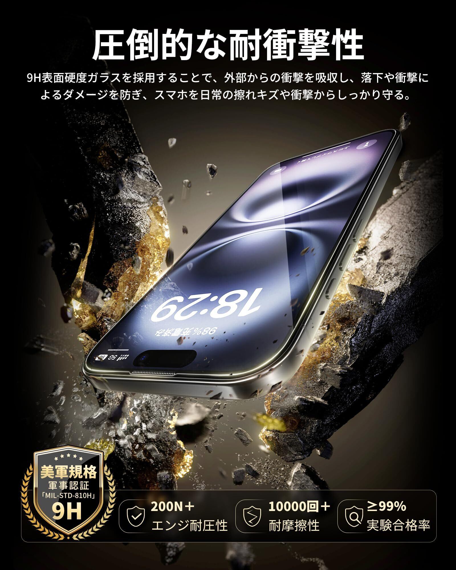 「優れた保護力・防塵ネット付き」米軍規格「MIL-STD-810H」に準拠(認証番号:SZXEC23002005001)の9H硬度ガラスを採用、鍵などの硬く鋭いものにぶつかっても傷が付きにくく、落下などの衝撃も最小限に抑えられ、スマートフォンの画面をしっかり保護できます。その上、極細黒縁で画面の端まで全面保護しているので、フチ割れともおさらば。また、防塵ネットのデザインなので、ホコリの付着を防止しつつ、スピーカーの音質に影響は与えません。