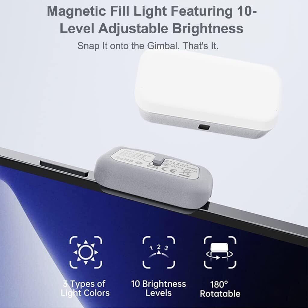 磁気フィルライト: 10段階の明るさ調節が可能で、暗闇でもあらゆる種類のショットで鮮明な結果が得られます。前面と背面のカメラに合わせて 180 度回転させることができます。 驚くべきことに、ジンバルに磁化されなくても機能します
