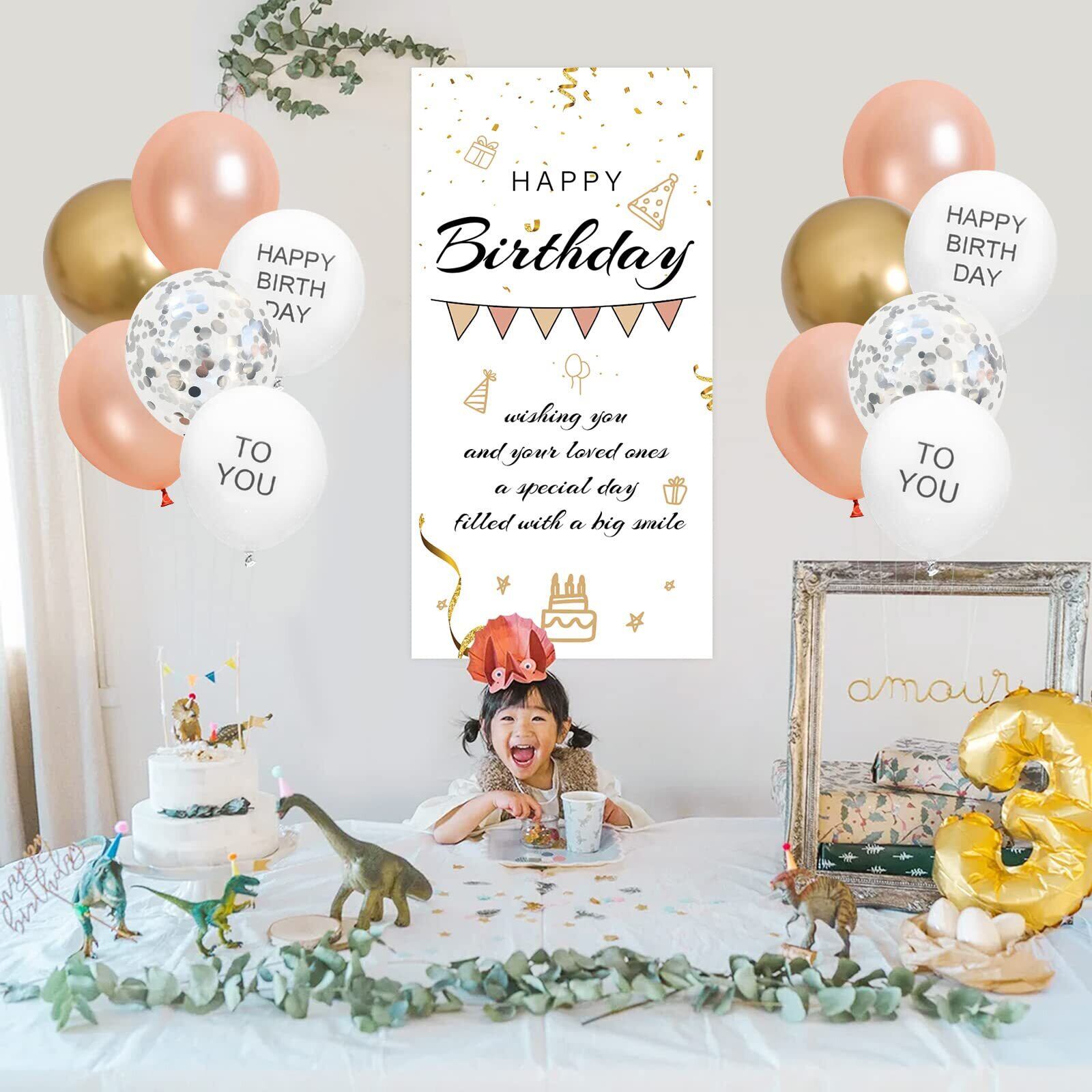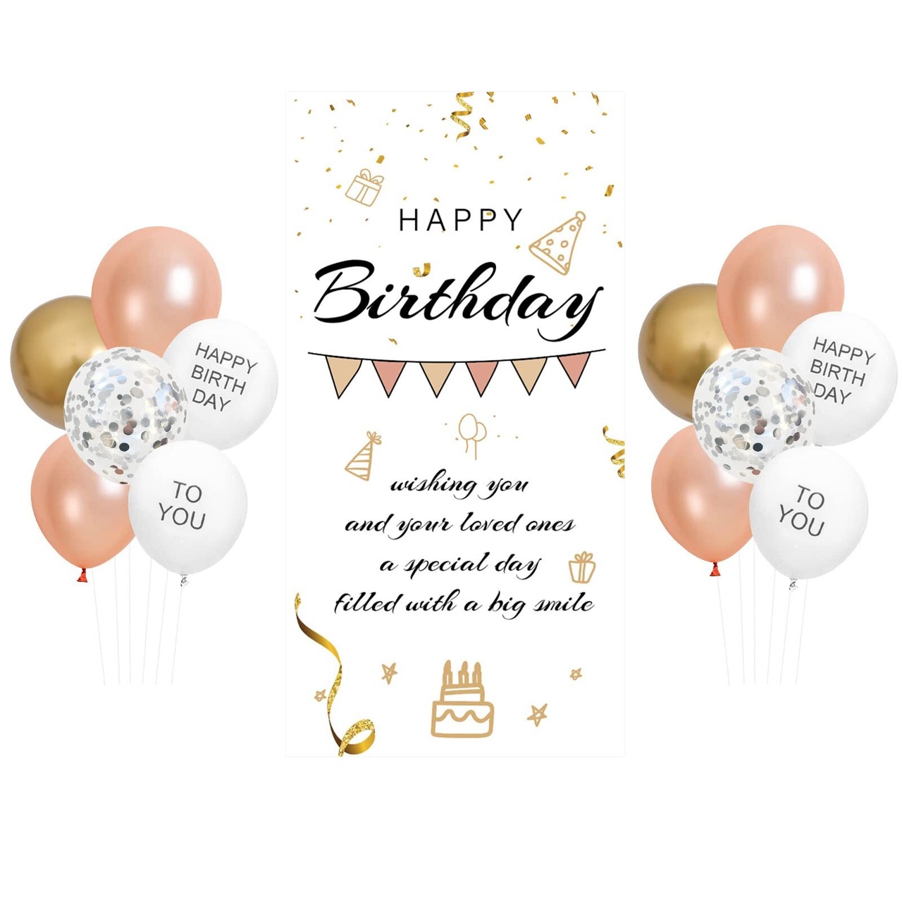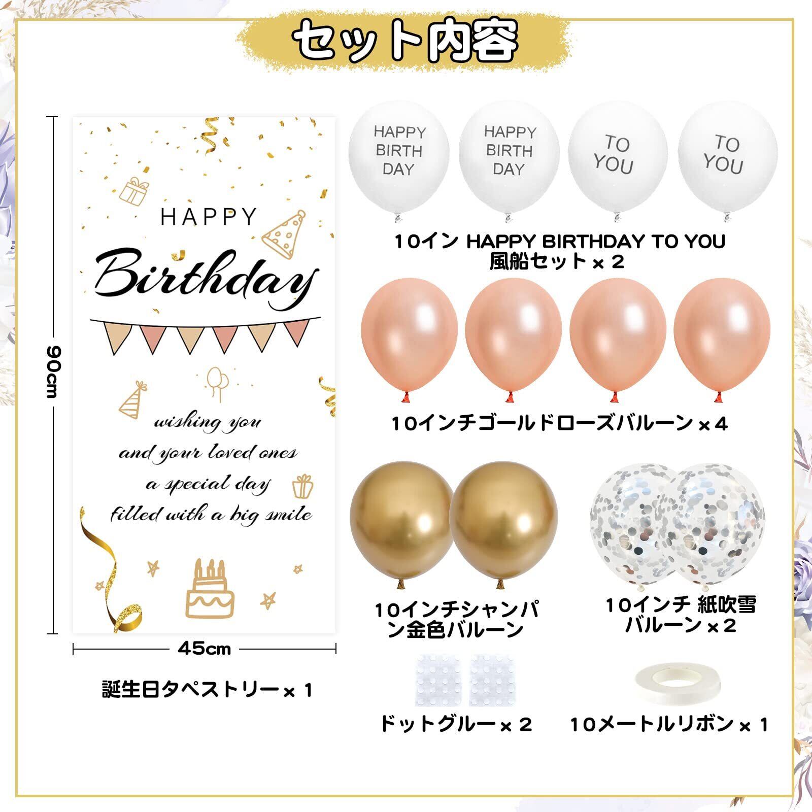 【誕生日タペストリー セット】90*45 cmの 誕生日 タペストリー1枚、happybirthdayバルーン2個、12インチシルバー紙吹雪風船2個、10インチバルーン4個(ローズゴールドx4、金色x2)、ドットグルー1個、10メートルリボンを含まれ~この誕生日飾り付けは人気のケーキ、バナーなどのオシャレな誕生日要素をデザインしています!誕生日パーティーに貼って、一瞬でパーティーの雰囲気が盛り上げ、友達や家族と一緒に写真を撮るのに最適。タペストリーの意味は「あなたとあなたの愛する人が笑顔に満ちた特別な日を過ごすように」家族・子供・親友・恋人など大事な人にぴったり。