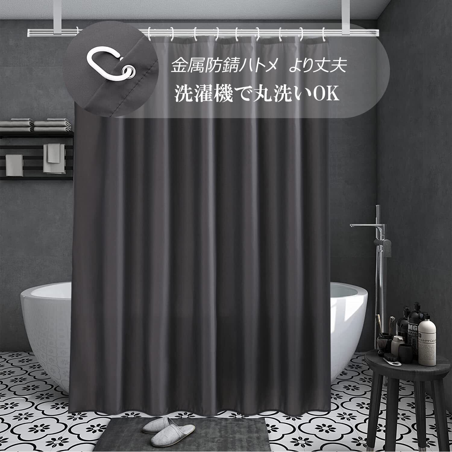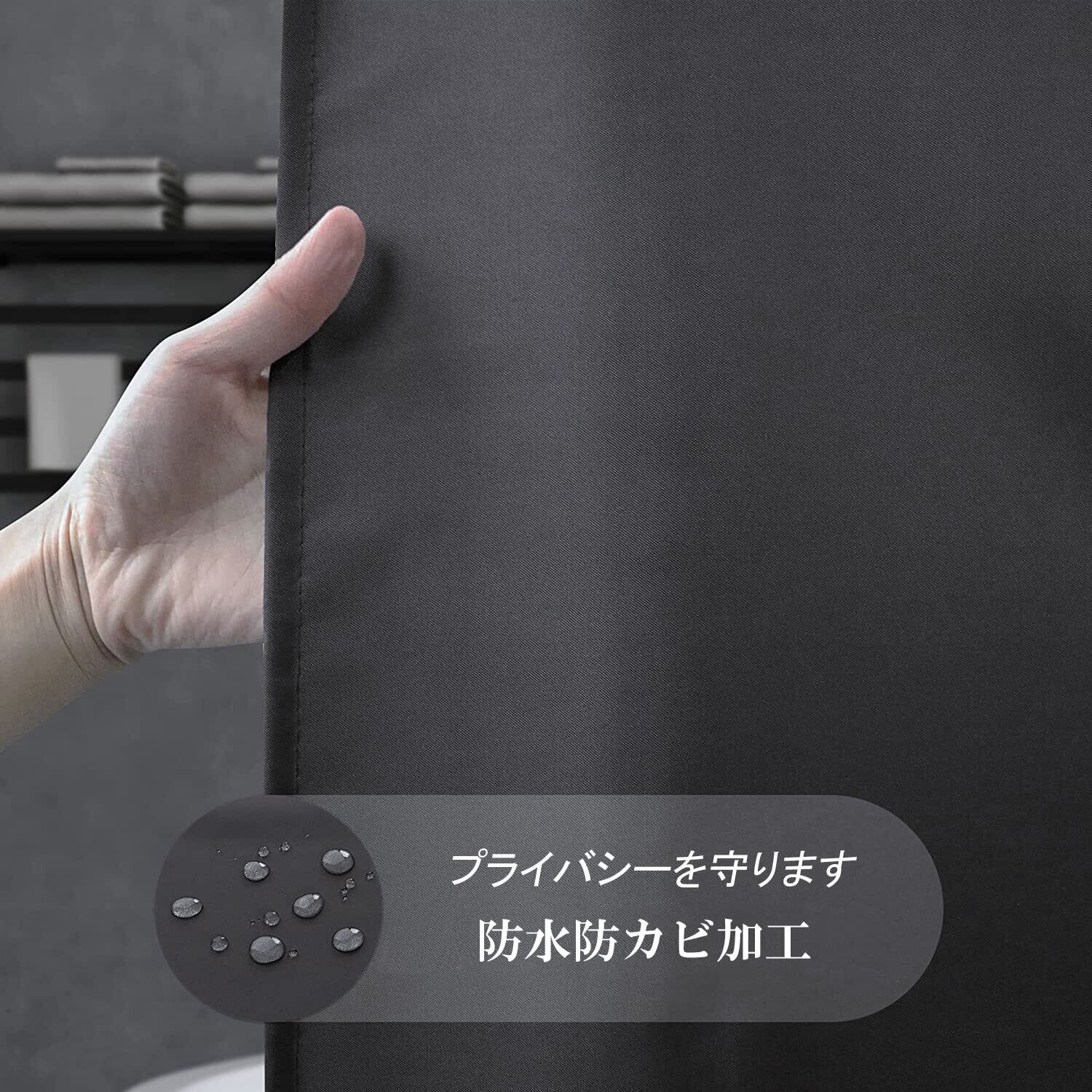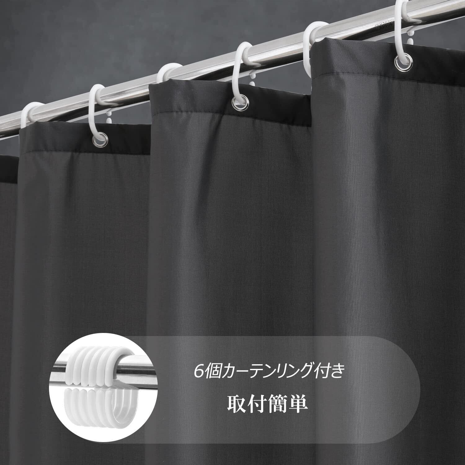 【サイズ】幅90x丈180cm 素材:100%ポリエステル 仕様:防水防カビ パッケージ内容:本体*1+カーテンリング*6 カラー:ダークグレー 無地