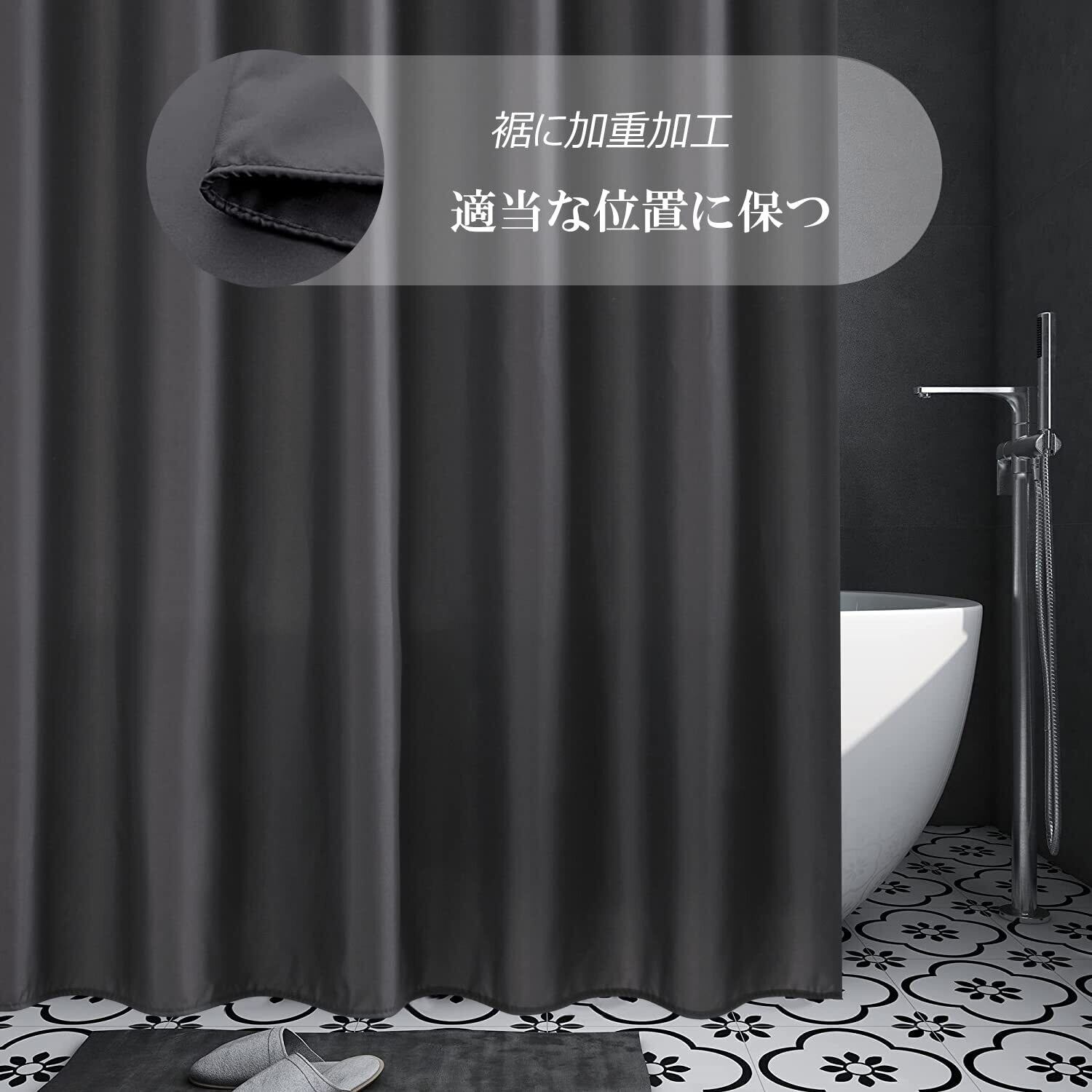 【保温・デザイン】断熱性がよく、部屋暖房ロス抑制、保温効果があり、寒い冬でも安心できるバスカーテン。シンプルな無地の灰色のデザインで、いつもバスタイムを快適にする保温シャワーカーテンです。