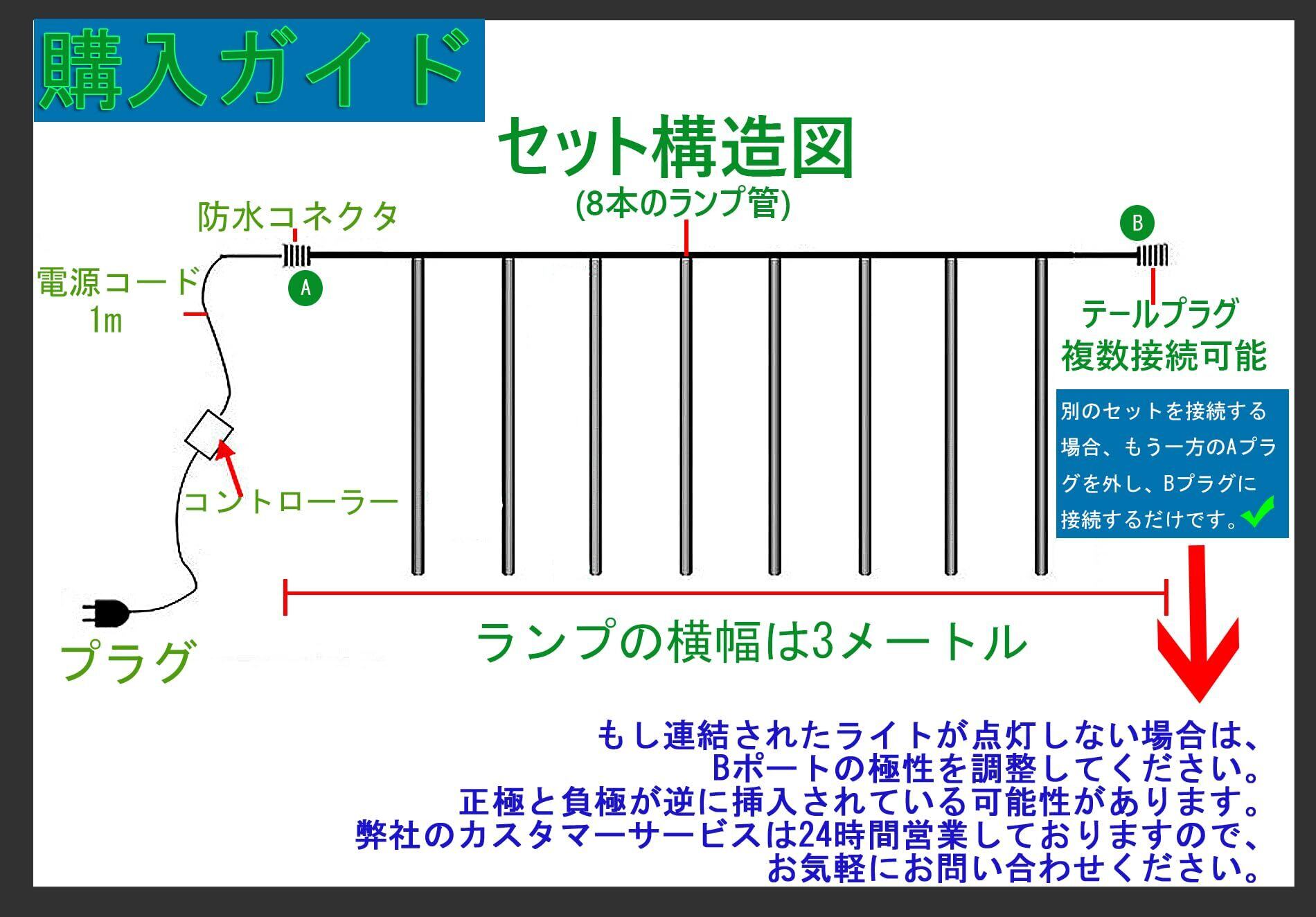 【4メートル、8本の灯管】この流星灯セットは、4メートルのライトストリップと8本のライト管が含まれています。50cmと30cmの2つの灯管の選択肢があり、ライトの色は暖かなイエローで、非常に簡単に使用でき、調整は不要です。差し込むだけで光り、電源を差し込むと、流星が降り注ぐかのような輝きを放ちます。複数のセットを連結できるので、柔軟な照明配置が可能です。