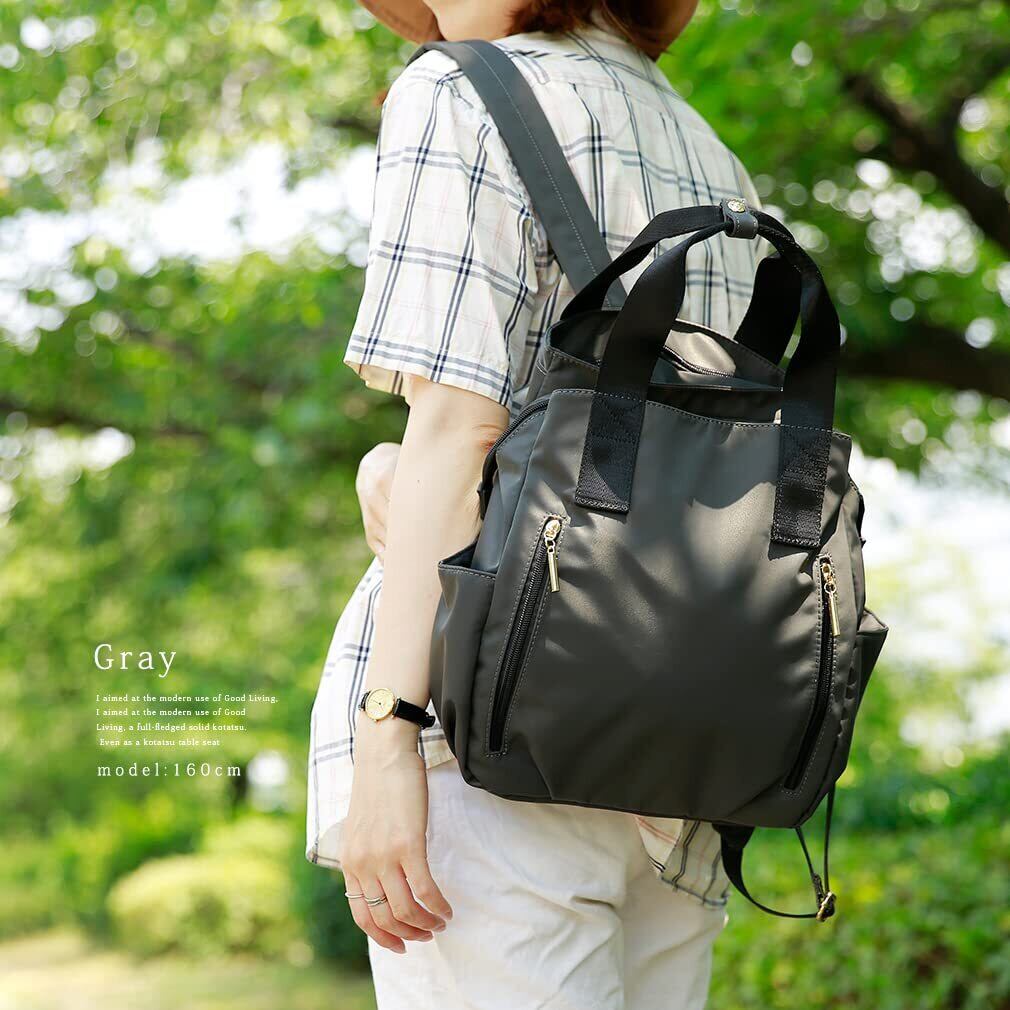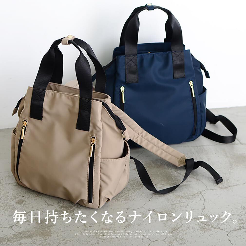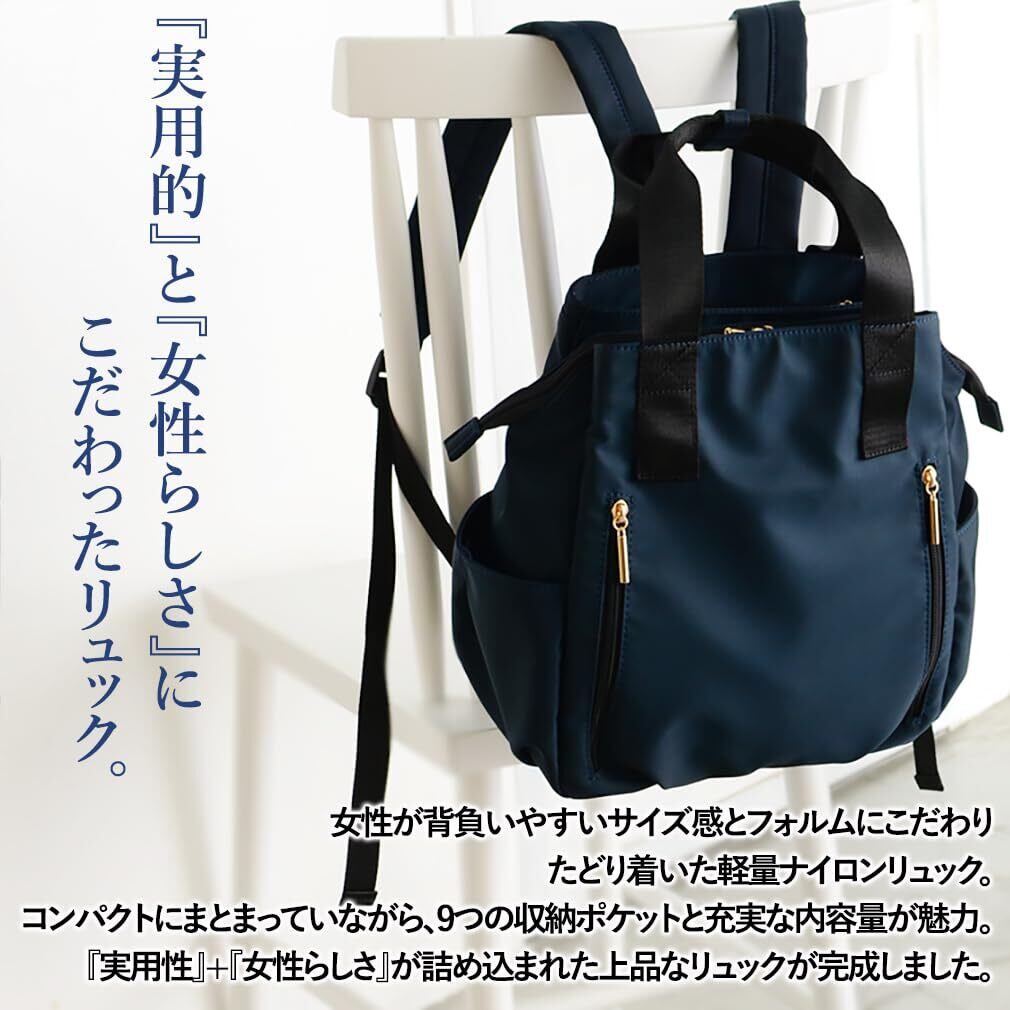 リュックのショルダーベルトが背面に収納できるようになり、手持ちで持つ時もスッキリしました。 『実用性』と『女性らしさ』にこだわったリュックが出来上がりました。 女性が背負いやすいサイズ感とフォルムにこだわり丸みのあるシンプルなデザインに。 また、コンパクトにまとまっていながら、9つの収納ポケットがある大容量が魅力のレディースリュックサックです。 メイン素材は軽量を考え、厚みのある上質なナイロン素材を使用しました。 収納スペースが豊富なので、こちらのリュックはマザーズバッグとしてもオススメです。