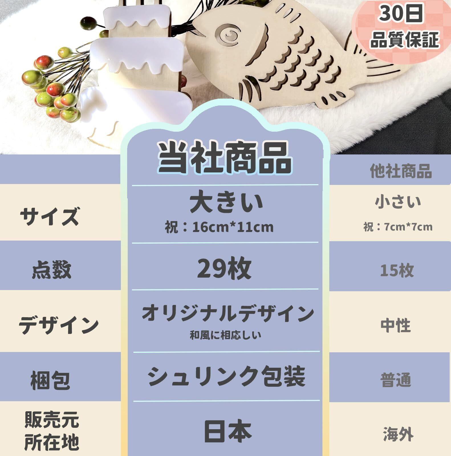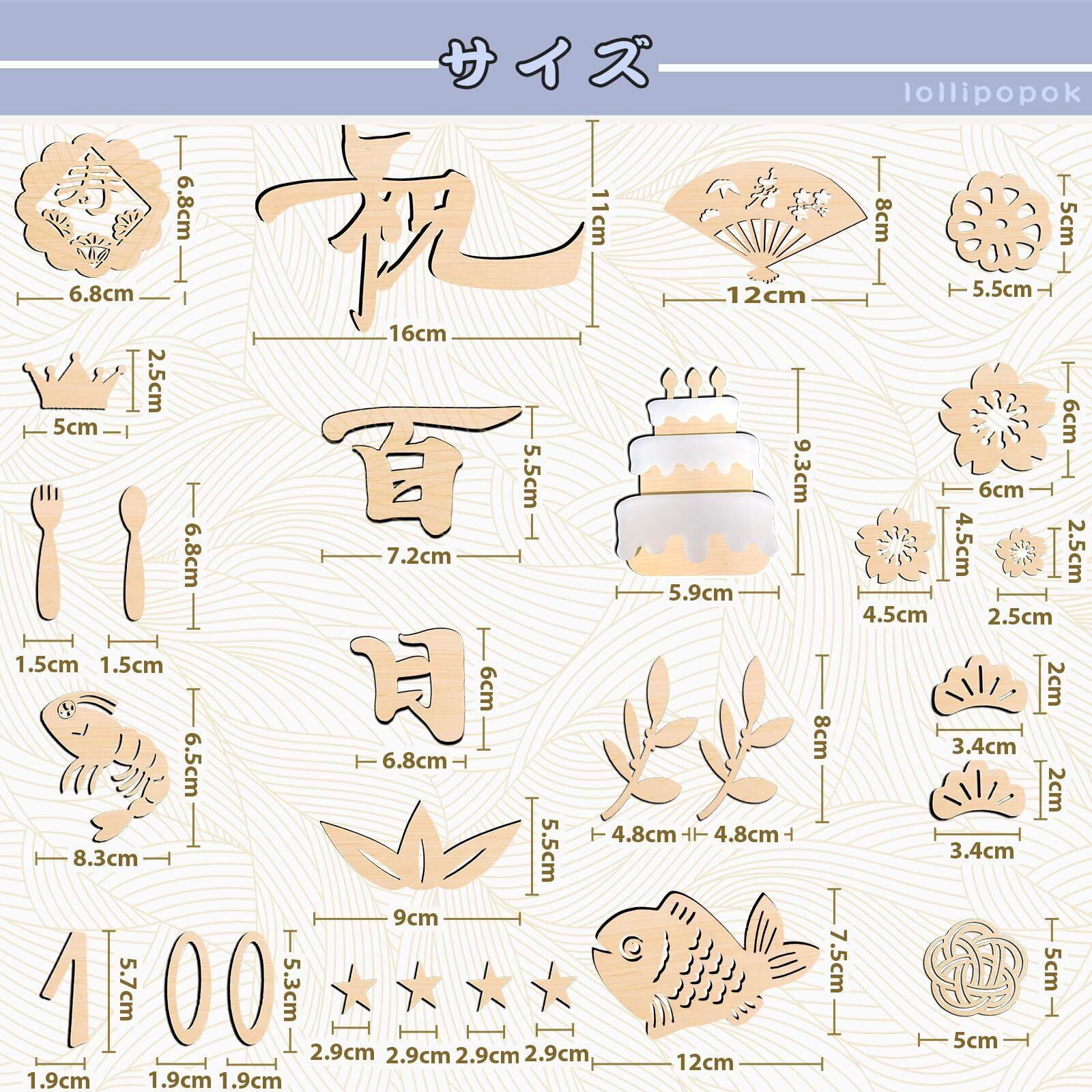 【セット内容】合計29枚:祝、百、日、各1枚、魚*1枚、桜*3枚、寿*1枚、エビ*1枚、ケーキ*1枚、王冠*1枚、梅結び*1枚、扇子*1枚、松の葉*2枚、蓮根*1枚、竹の葉*1枚、数字1*1枚、数字0*2枚、フォーク*1枚、スプーン*1枚、葉*2枚、星*4枚、赤の紐*1枚。厚さ約3mm。