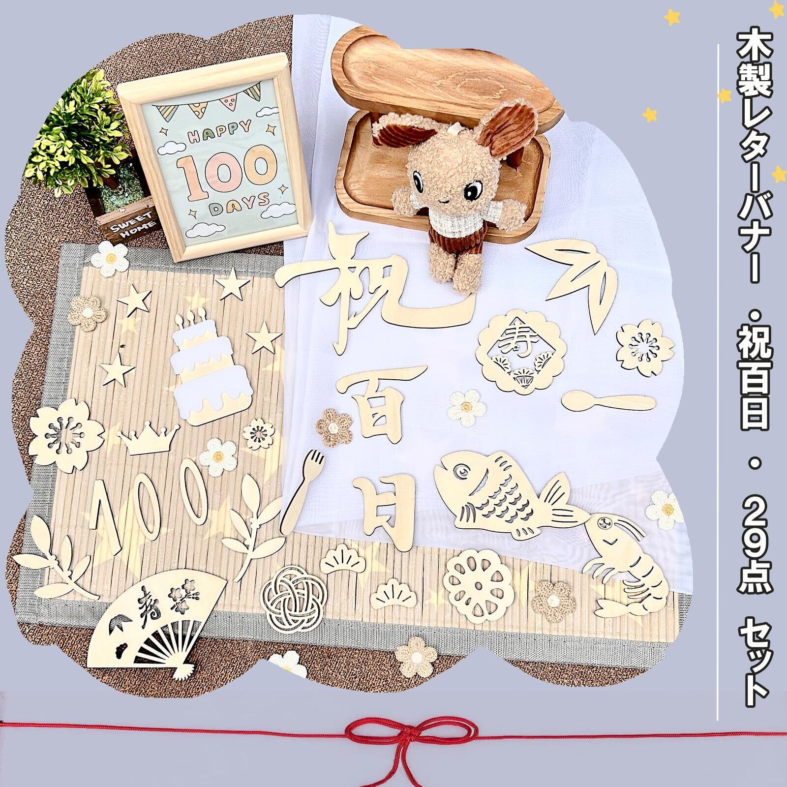 lollipopk 祝百日 29枚 レターバナー 木製 お食い初め ウッドバナー 100日 赤ちゃん 飾り ウッドレター ナチュラル お祝い (a2)