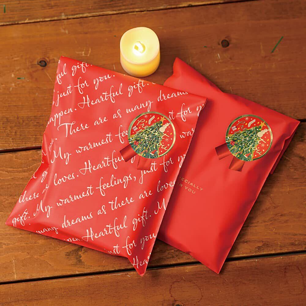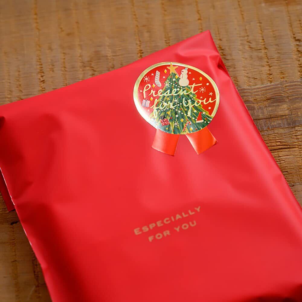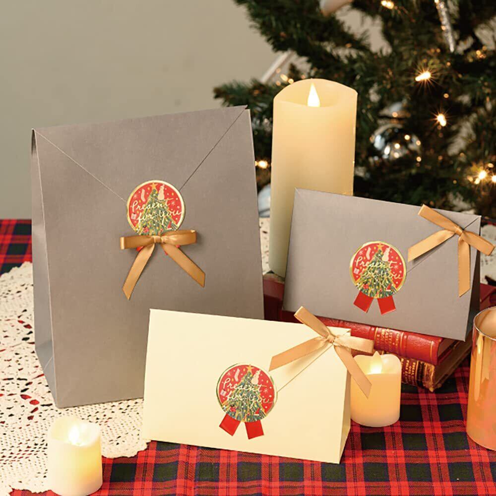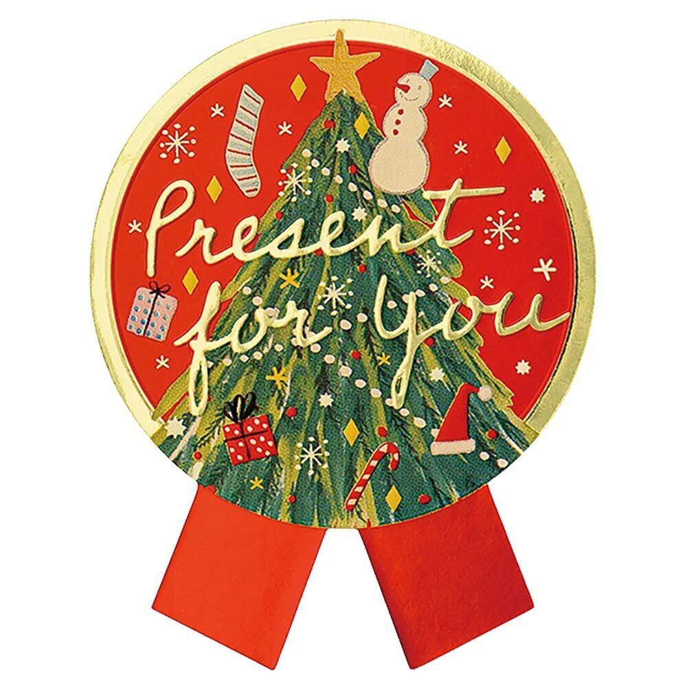 クリスマスベアラー シリーズの、ツリーデザインが可愛い、リボン型シールです。エンボス加工が楽しく、1枚でギフトが締まる優秀なクリスマスのシールです。