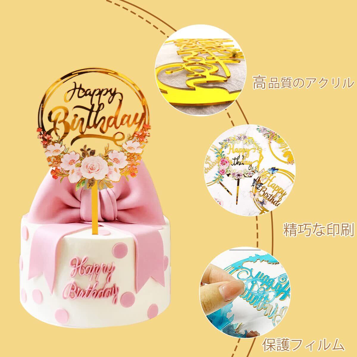 【ケーキトッパー】お花や蝶ちょうが飾れた誕生日ケーキトッパーです。キラキラしているゴールドの色は豪華で明るいです。ケーキを可愛く華やかに飾ります。 【メイン素材】高品質のアクリル素材で作られたケーキトッパーは表面が滑らかです。裏面に保護フィルムが付いて、使用する時に剥がしてください。 【サイズ】横:10cm-10.8cm、縦:14.5cm-16.5cm。7種類のデザインがあり、ケーキの装飾やフルーツの装飾にぴったりです。 【適用場合】ケーキに挿すだけでケーキの華やかさが増し、誕生日の雰囲気を高めます。誕生日パーティー、母の日などに適しています。 【パッケージ】ケーキトッパー7点セット。