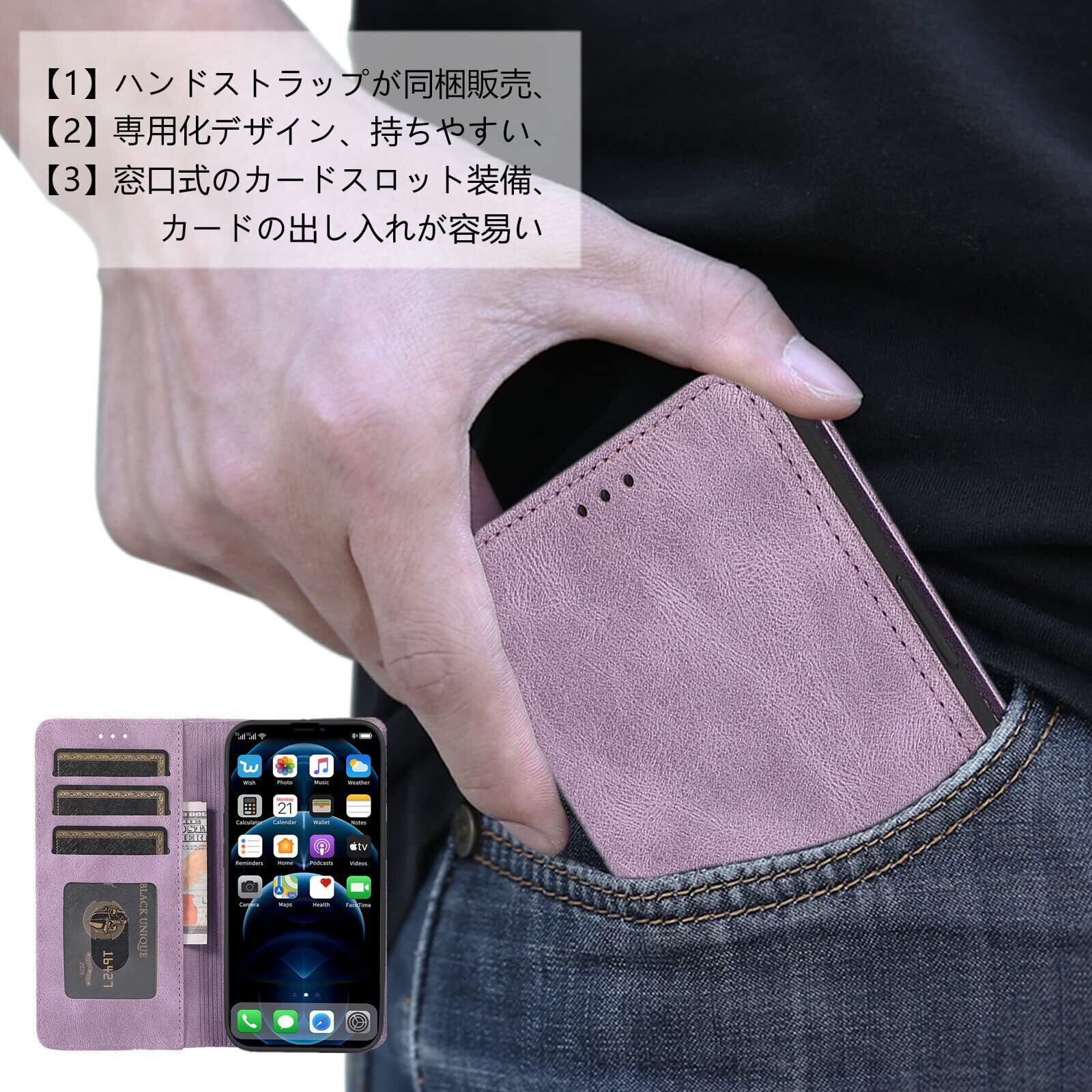 【ポイント②】:マグネット内蔵式のケースです、留め具なしでシンプルなデザイン感をよりアップさせます。表面は手触りの良い合成レザーです、内部の柔軟なTPUホルダーは衝撃吸収の性能が抜群で、万が一の落下した時、大切なスマホ本体をしっかり守ることができます。