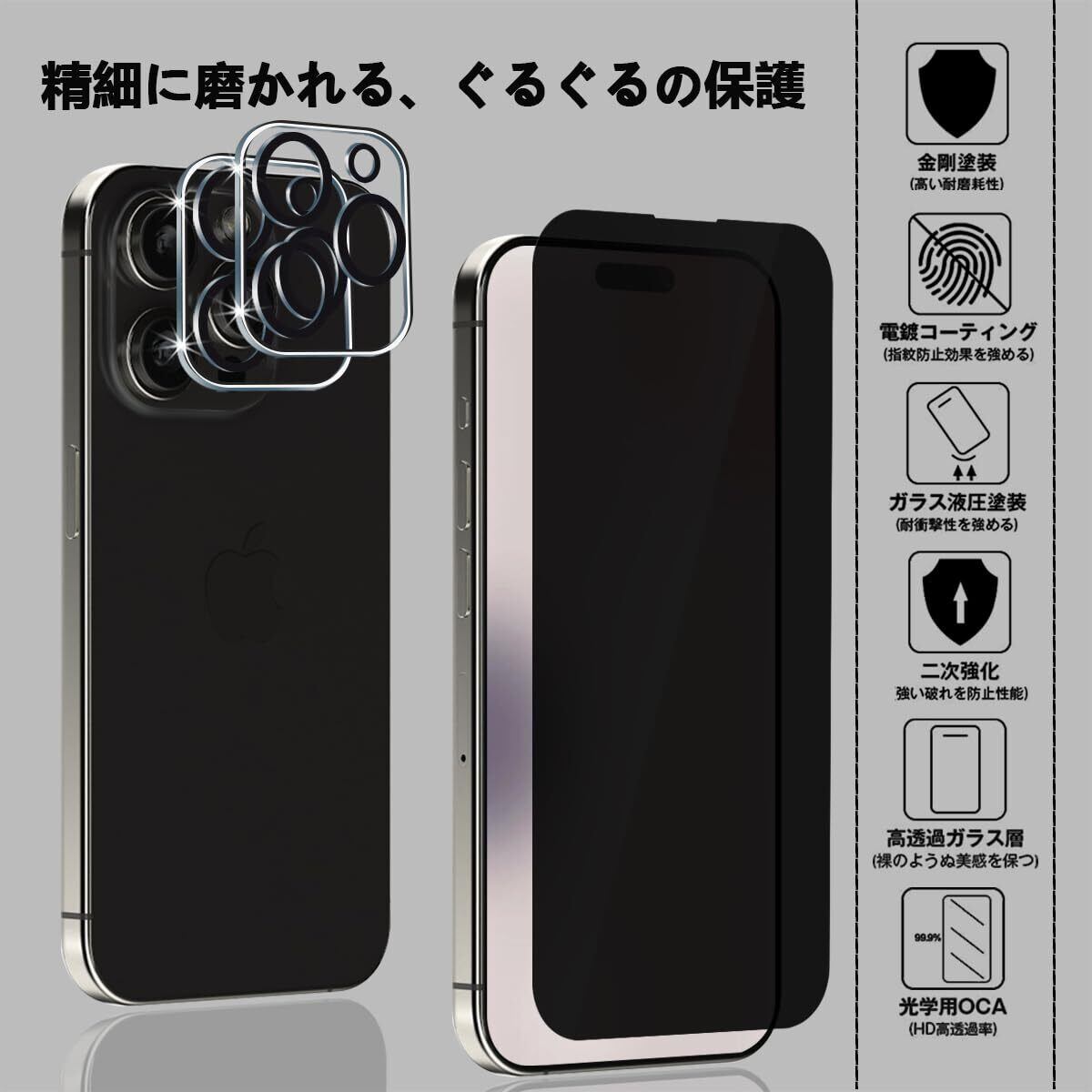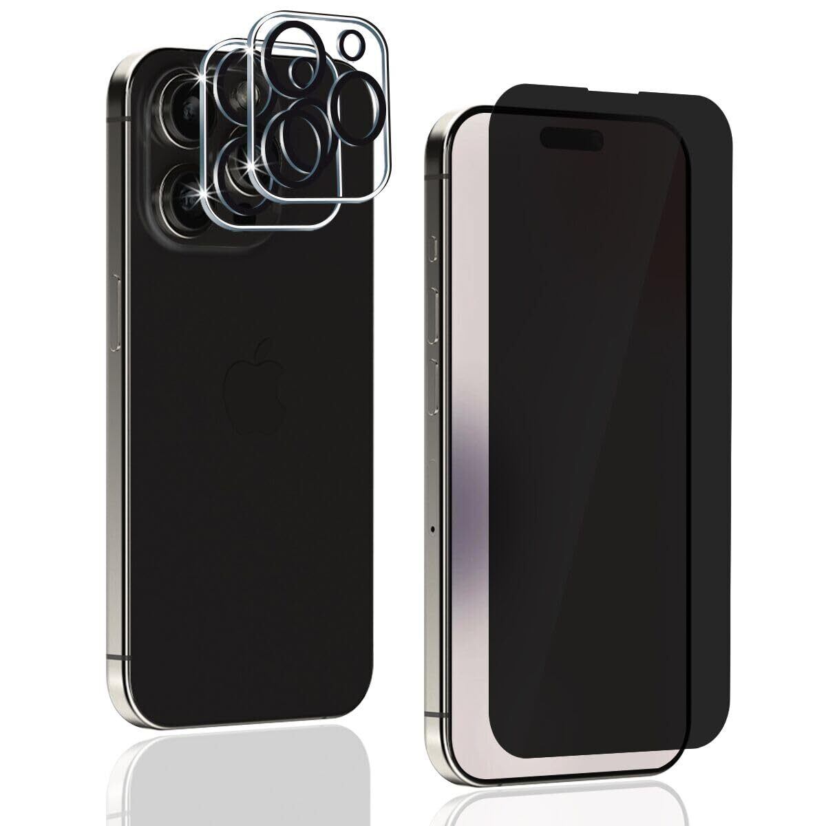 【1+2枚入り】iPhone 15 Pro Max ガラスフィルム 覗き見防止 (1枚) + 15 Pro Max カメラフィルム (2枚) 全面保護フィルム プライバシー保護 カメラ レンズ 保護カバー 旭硝子製 【左右つ方向のぞき見防止 2.5D 高透過率 気泡ゼロ 硬度9H 指紋防止 貼り付け簡単】液晶保護フィルム iPhone 15 Pro Max 対応( 6.7インチ)