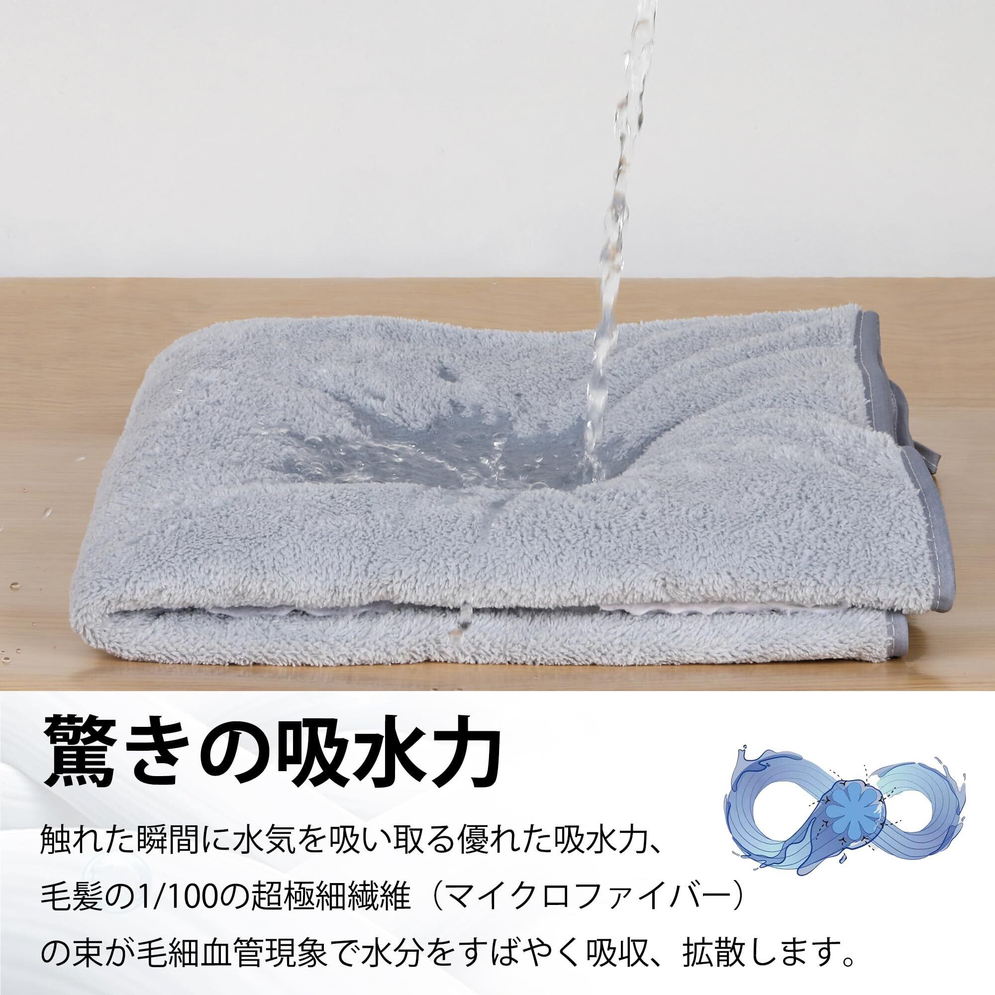 【吸水性がバツグン】“毛細管現象”を持つマイクロファイバーバスタオルは吸水力が高いことはもちろんのこと、乾くのがとても速いという特徴を持っています。その速さは綿製品に比べて約2~6倍の速さともいわれています。