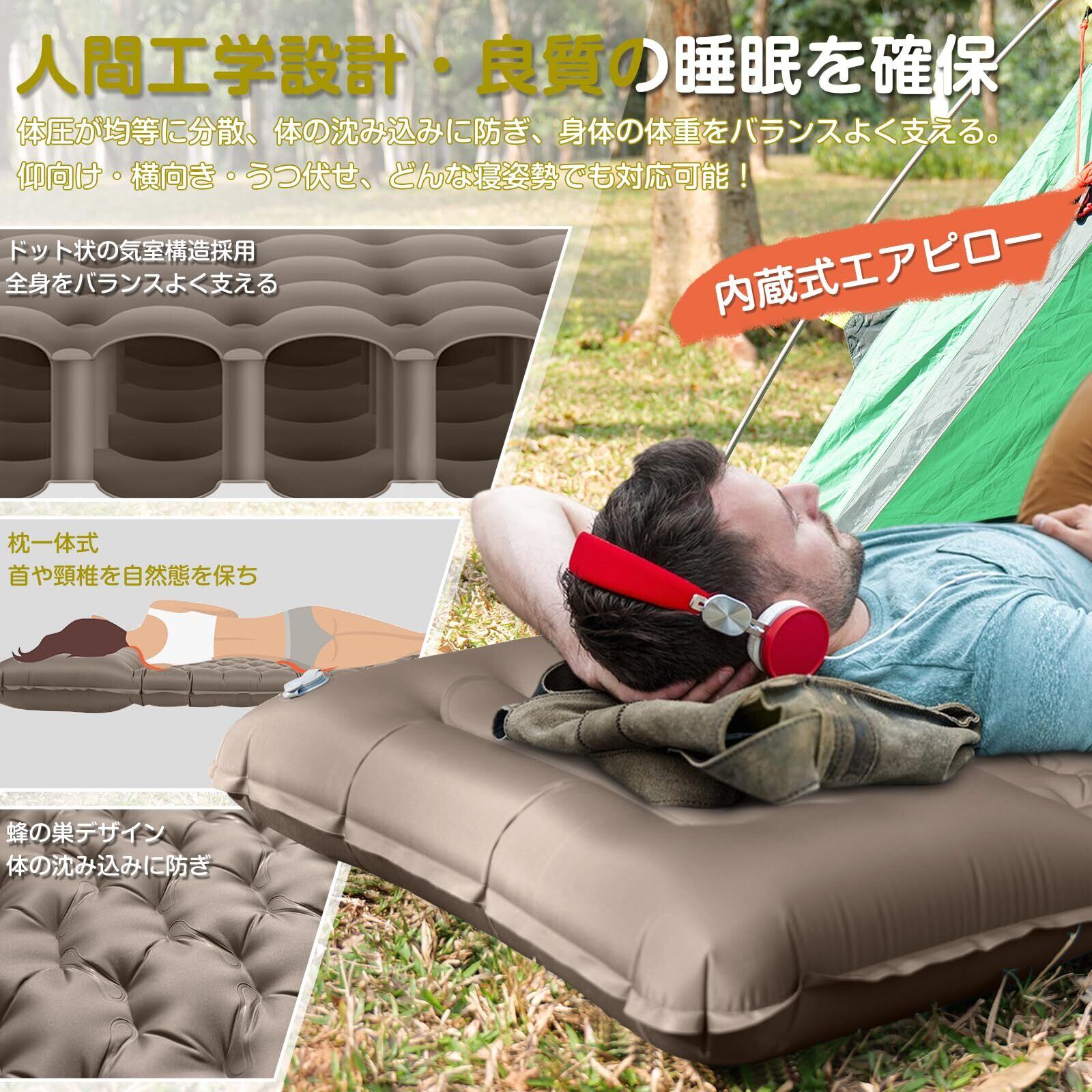 【 枕一体式、寝心地よい独特構造 】●人間工学に基づいて設計した枕を内蔵し、首や頸椎を自然な形にキープして、快適にぐっすり眠ります。別の枕を携帯する必要がないので、キャンプが便利になります。●FIRPOWエアーマットの厚さは10cmで、使用時に車内の段差や地面のゴツゴツ感が体に伝わらず、底つき感もなく、冬の気になる地面からの冷気もシャットアウトでき、寝心地が良い。