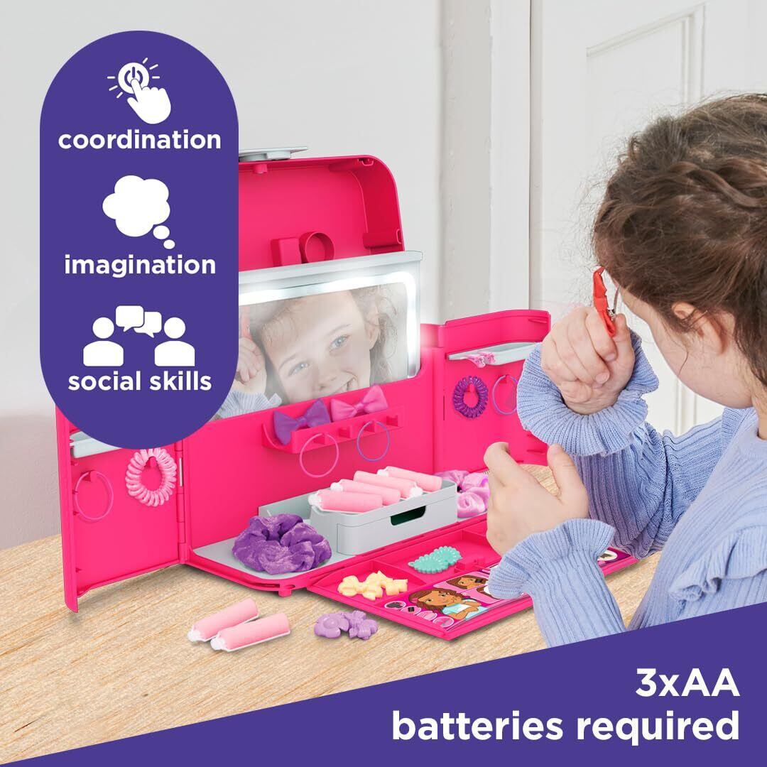 ケースを開けるとライトアップミラー内蔵のドレッサーに早変わり!ミラーは上へ引き出すとライトアップ!リボンの形をしたヘアピンやベルベット調のシュシュが子どもの好奇心をくすぐります。スタイリングブック付きで、いろいろなスタイルを試すのに役立ち、自分はもちろん、お友達やお人形などにピッタリのヘアスタイルを見つけましょう。