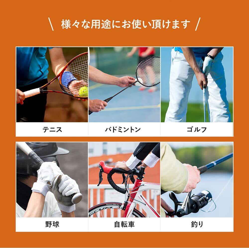 多用途に対応する優れた汎用性 このグリップテープは、テニス、バドミントン、スカッシュなどのラケットスポーツだけでなく、自転車のハンドルバーやバット、フィッシングロッドなどにも使用できます。優れたグリップ力と吸汗力を持つこのテープは、多様な用途に対応できるため、スポーツやレジャーのシーンで幅広く活躍します。