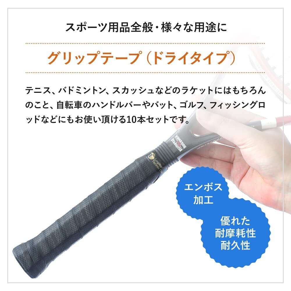 エンボス加工が施されたドライタイプのグリップテープは、テニスやバドミントンなどのラケットスポーツで最高のグリップ力を提供します。薄手でありながら抜群の吸汗力を持ち、無臭で常に清潔に保つことができます。大容量の10本セットでコストパフォーマンスに優れ、交換のタイミングも自由自在。