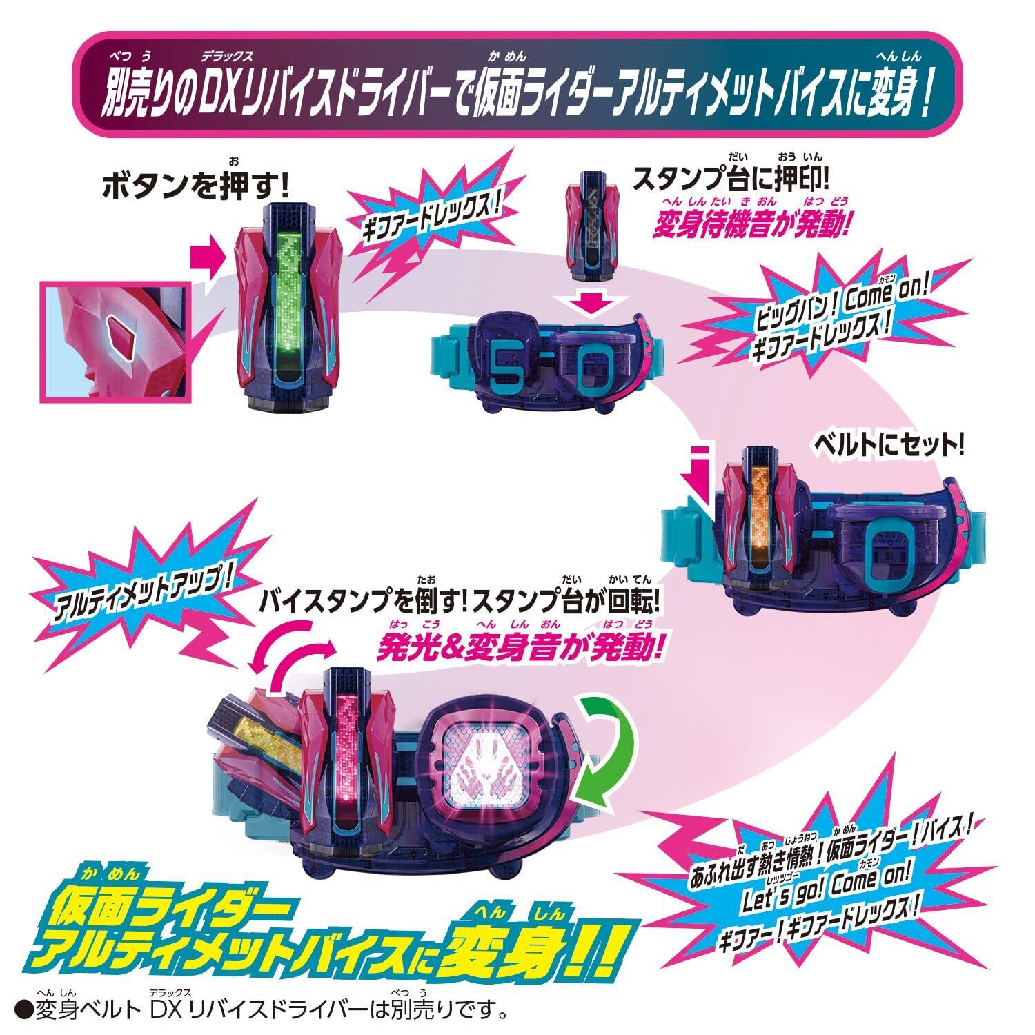 ギファードレックスバイスタンプが2つに分離!ギファードレックスバイスタンプ(アルティメットリバイ)のボタンを押して、DXリバイスドライバー(別売り)のスタンプ台に押印しベルトにセット!ギファードレックスバイスタンプを倒すと、スタンプ台が回転し、LED発光&変身音が発動!仮面ライダーアルティメットリバイへの変身遊びが楽しめます。