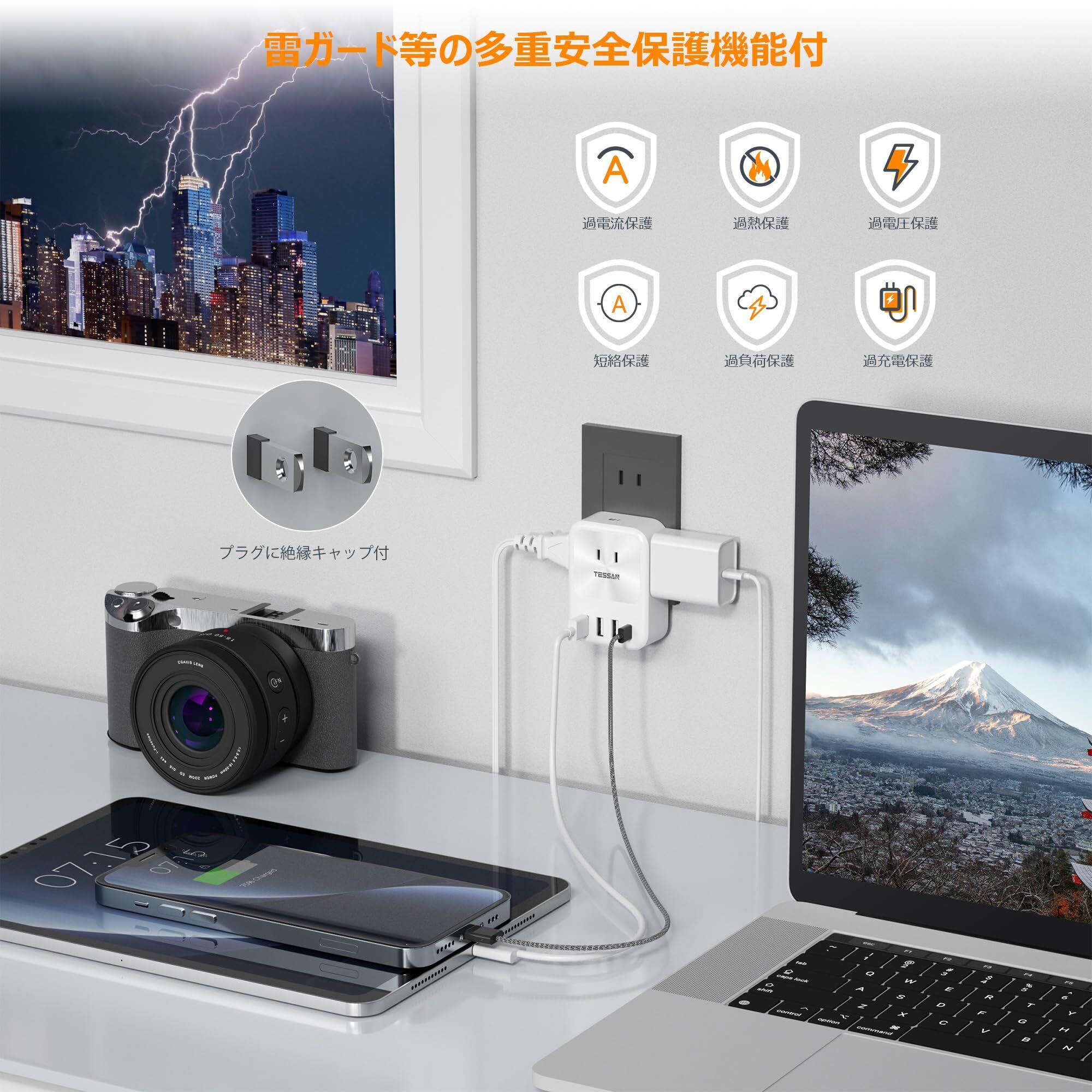 USB コンセント タップ 電源タップ USB-C付き TESSAN 3個AC口 3個type-Aと1個Type-Cポート たこあしコンセント 3口 タコ足配線 充電タップ マルチタップ 雷ガード付 小型軽量 日本国内でのみ使用可能