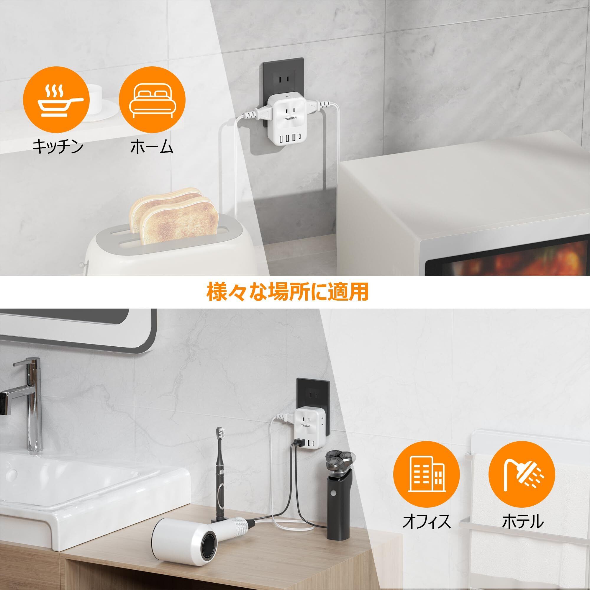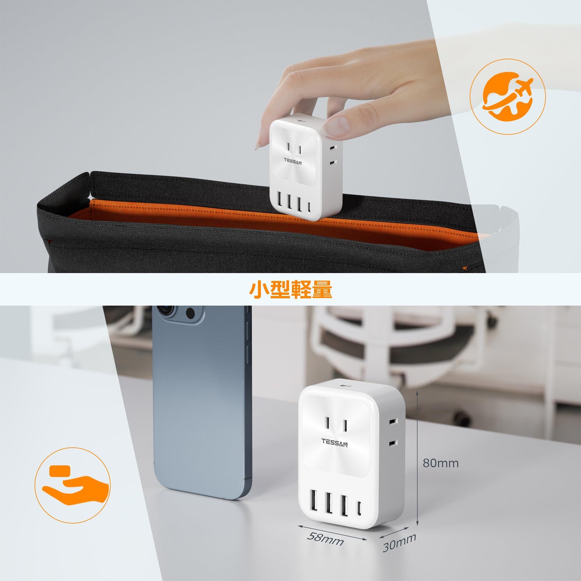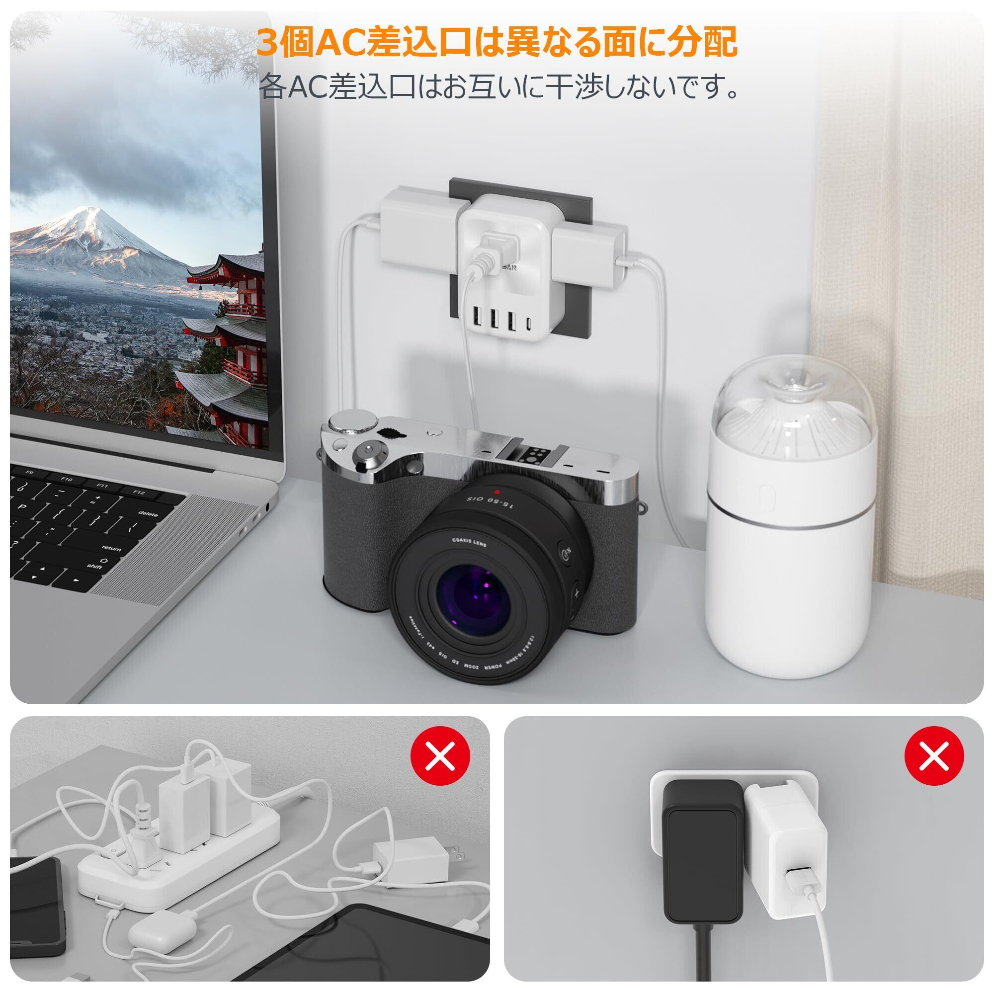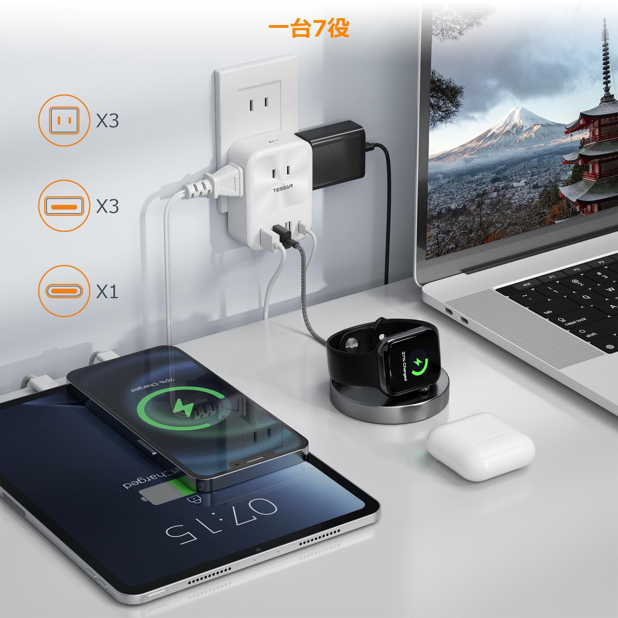 【1台7役のusb 電源タップ】このusb コンセント タップは3個のusb-aポート、1個のusb-cポートと3個のac差込口を搭載しています。3個のAC口は三つの方向に配置されていて、お互いに干渉しないで、大きなアダプター同士が同時に挿入しても大丈夫です。これ1つのusb タップで、7台の機器を同時に充電できます。