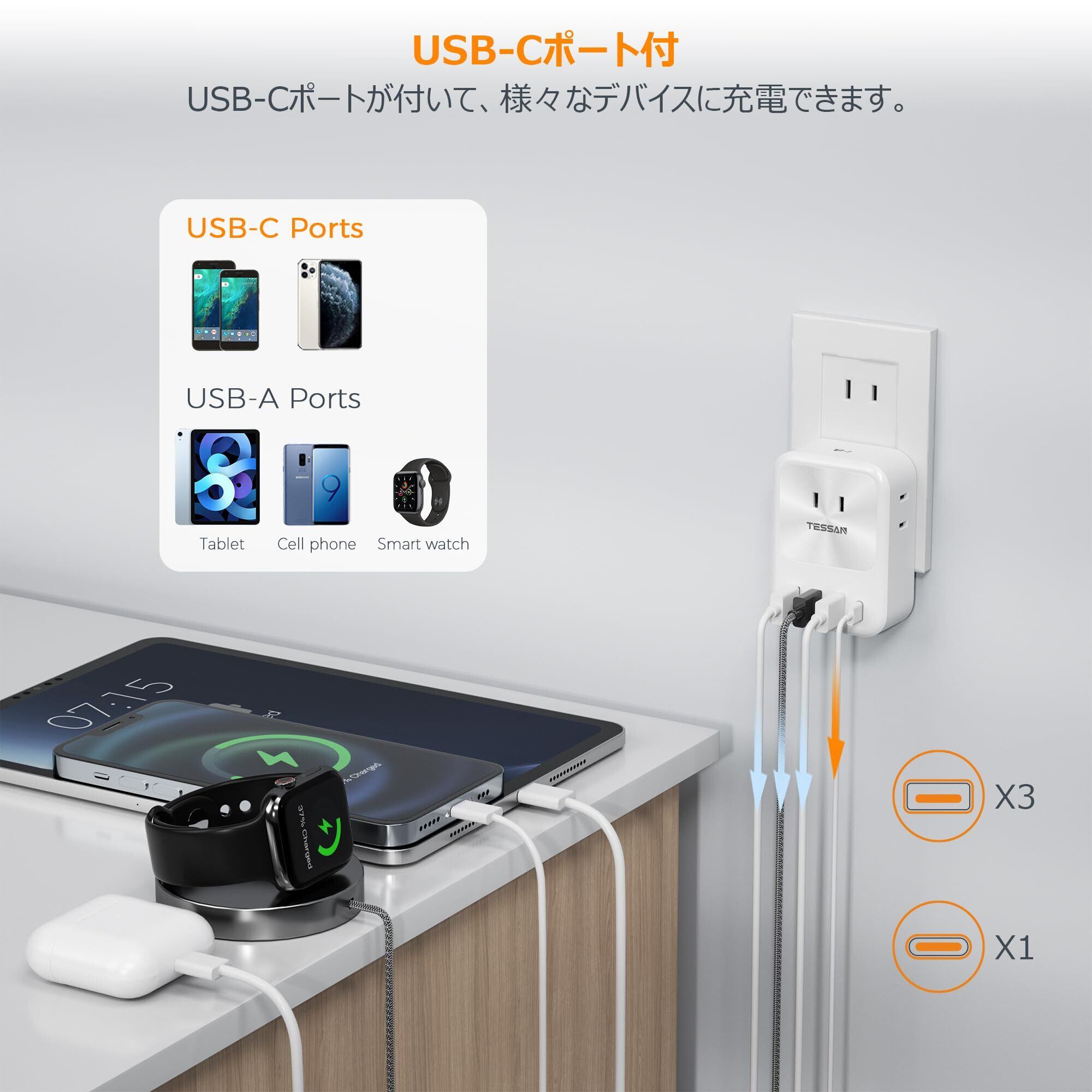 【USB-Cポート付のusb充電タップ】このusb 電源タップは三つのtype-aポート及び一つのtype-cポートがあります。type-aポート単独で使用する場合、出力は5V-2.4Aになります。type-cポート単独で使用する場合、出力は5V-3Aになります。スマートフォンやタブレットなどの多機種の電子機器への充電ができます。