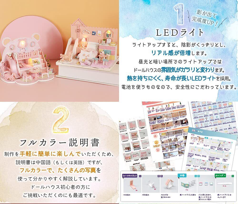 moin moin 1/24 ドールハウス 【 日本語説明書 】 ミニチュア DIY 手作りキット セット 猫 ベッド ねこ すべり台 ピンク 初心者向け | LEDライト + アクリルケース (【日本語】ねこさんほわほわルーム) 2109DH290