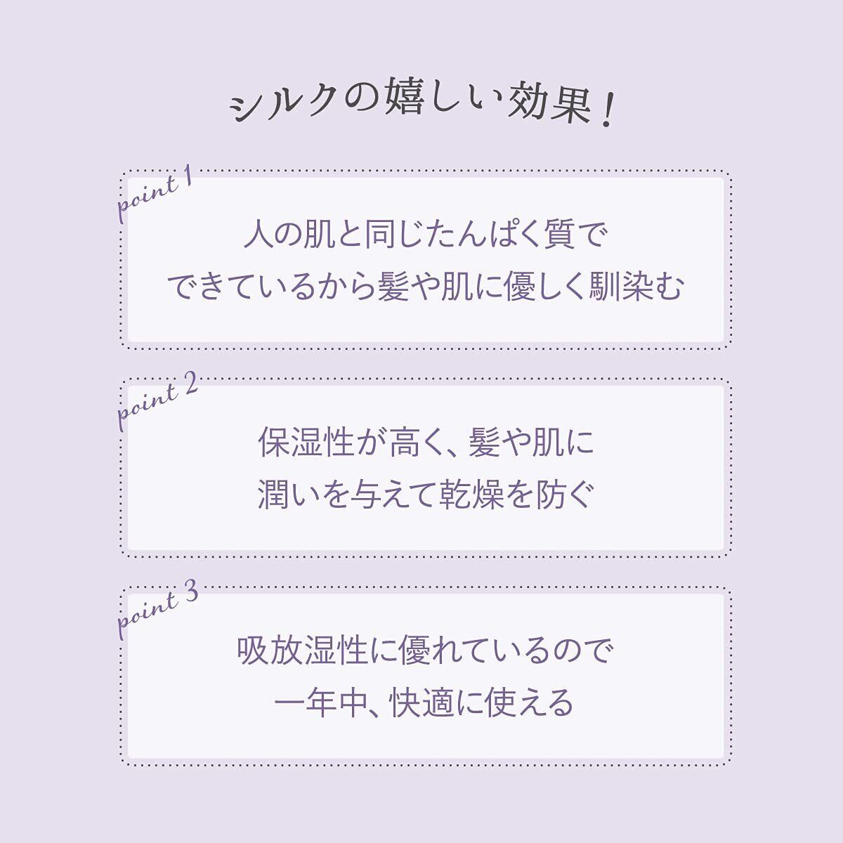 【シルクの嬉しい効果】1.人の肌と同じたんぱく質でできているから、髪や肌に優しく馴染む。 2.保湿性が高く、紙や肌に潤いを与えて乾燥を防ぐ。 3.吸放湿性に優れているので、一年中快適に使える。
