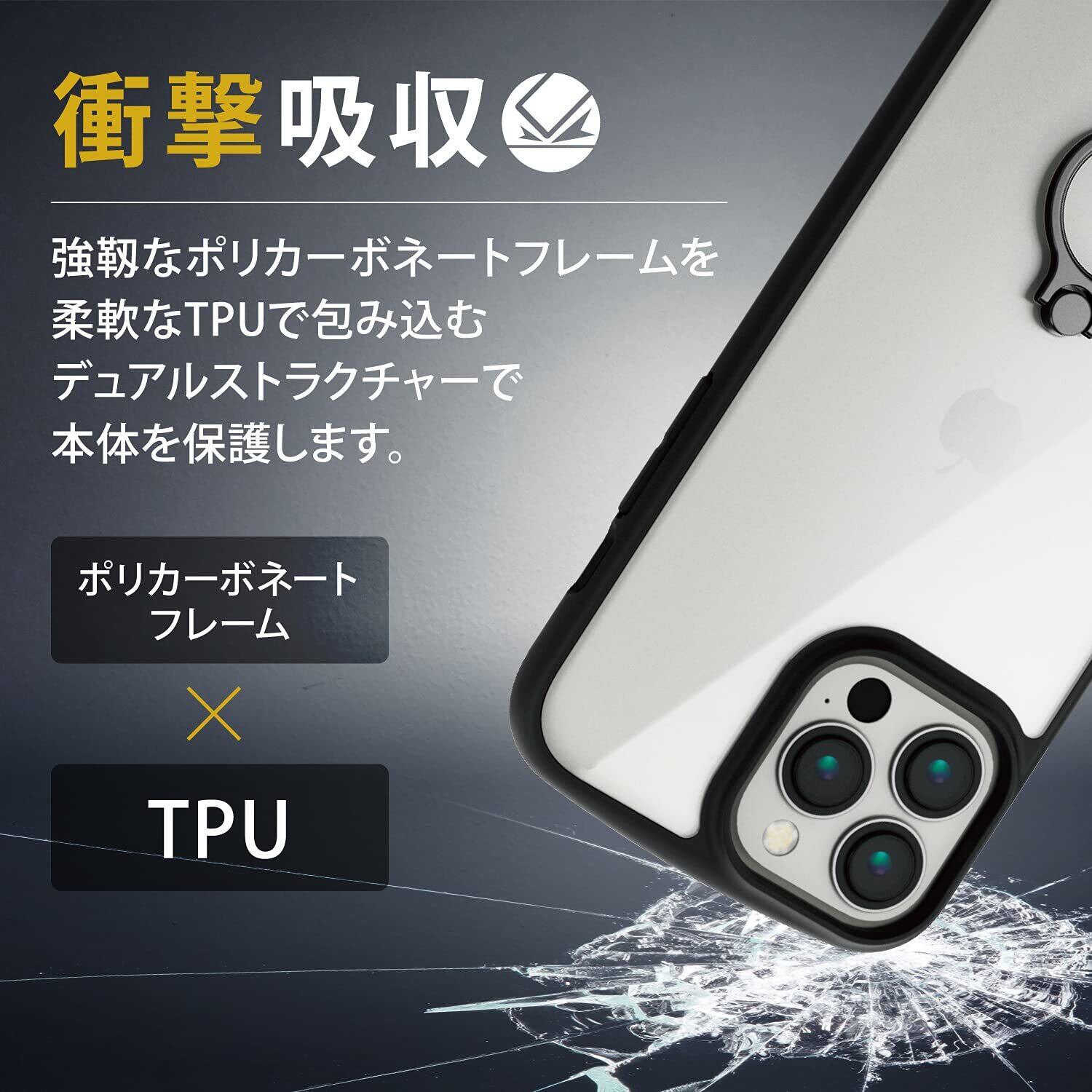 ■全周に配置した独自設計のエアクッションが衝撃を吸収し、背面には高硬度8Hの特殊樹脂を採用した落下防止リング付きのiPhone 13 Pro Max用TOUGH SLIM LITEケースです。 ■ケース背面に機器本体の落下を防止するリングが付いています。 ■リングは360度回転するので手の大きさに合わせて快適に保持できます。 ■リングを立てておくことでスタンドとしても使用でき、動画視聴などを快適に楽しめます。 ■TPU素材とポリカーボネートの2種構造でしっかりと保護します。