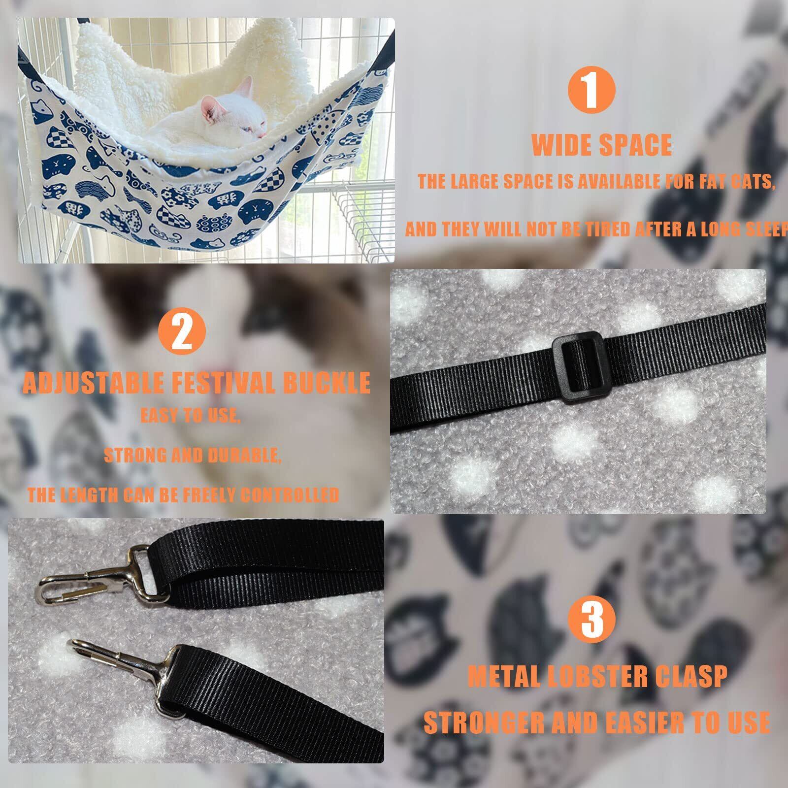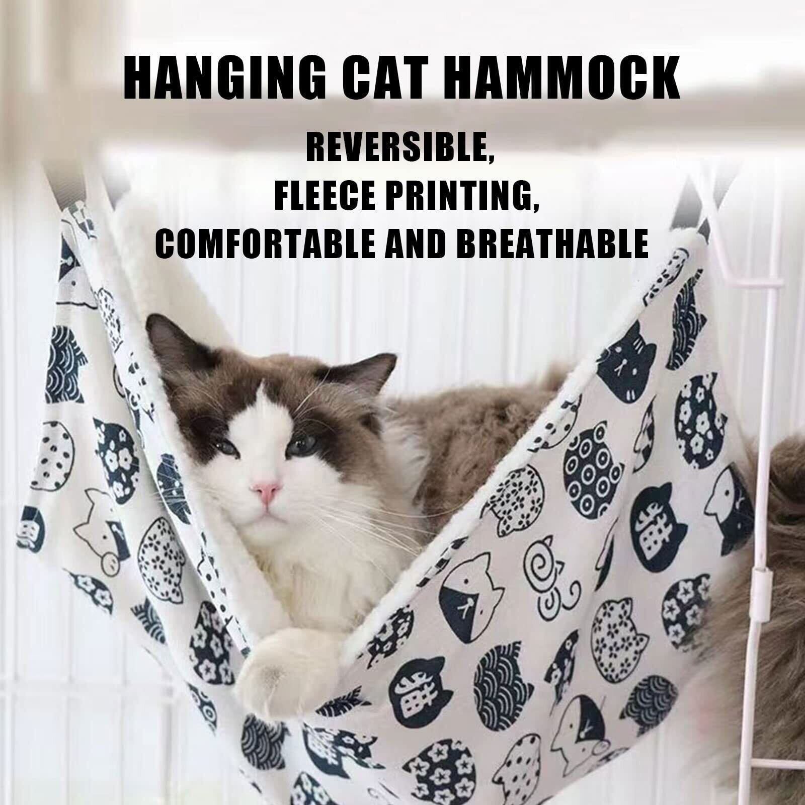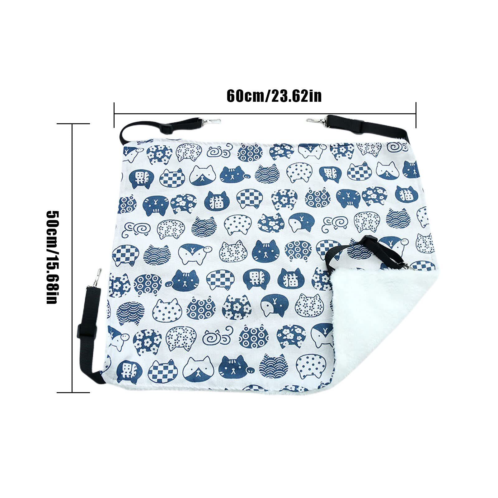 材質:綿、ポリエステル、合金 サイズ:60cm*50cm キャンバス生地と起毛生地で作られた猫用ハンモックです。リバーシブルのハンモックは夏でも冬でもご利用いただけます。キャンバス生地は通気性が良いので夏に適しています。起毛素材は柔らかくて保温性に優れるので、寒い時期でも猫が快適に過ごせます。 金具が付いているのでケージに取り付けやすい。柄が可愛くてケージに設置すると、ケージ内の雰囲気が変わります。 大きめなサイズで安定感があります。猫がハンモックに乗って、遊んだり寝たりします。