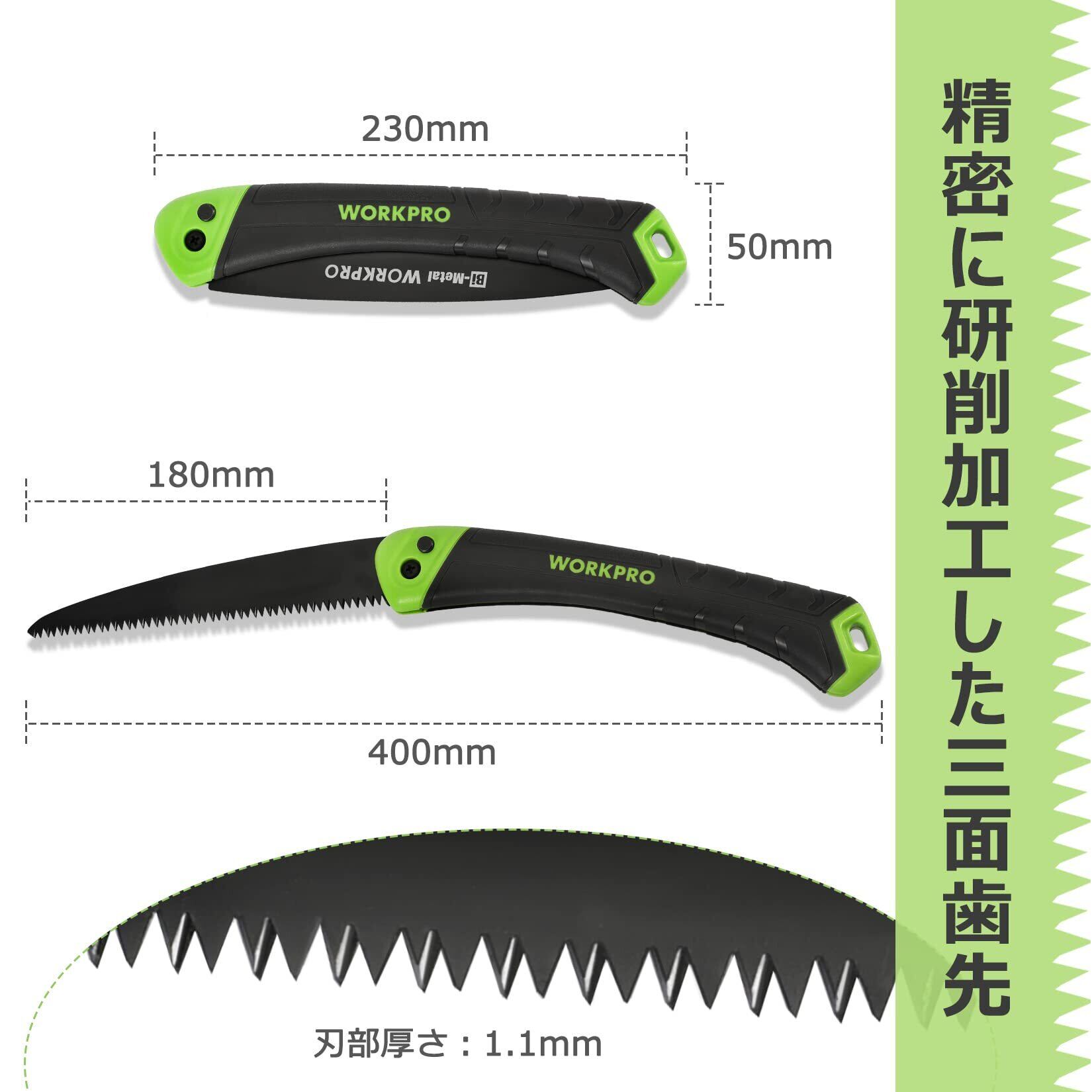 WORKPRO 折込のこぎり ノコギリ 刃渡り180mm 三面歯先 エラストマ樹脂グリップ 安全ロックボタン付き キャンプ 木工 園芸用のこぎり 最大剪定直径:枝切り350mm、生木200mm