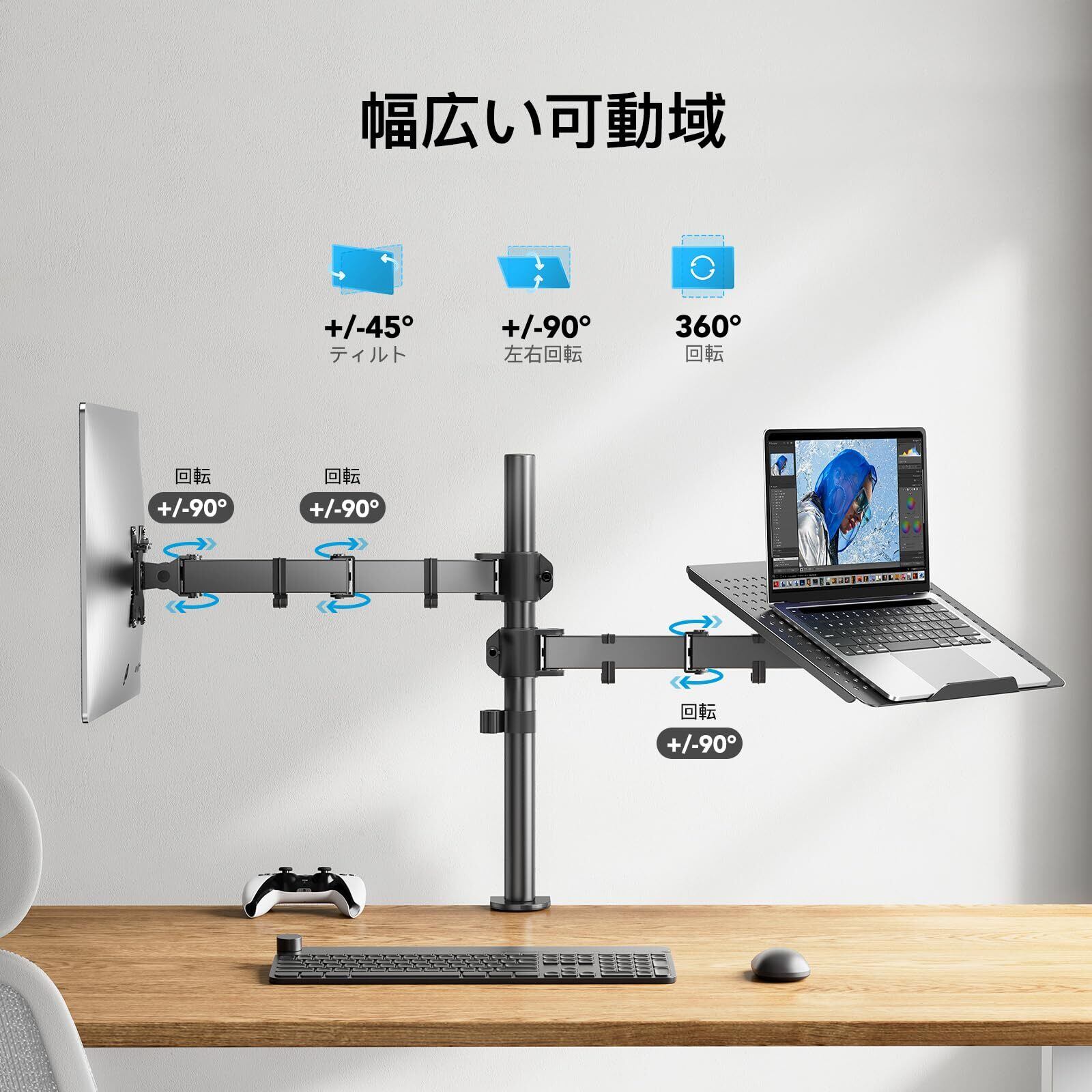 【2in1モニターアーム】PCモニターアームとノートパソコンスタンドが融合されていて、ディスプレイやノートパソコンがより快適に使えます。PCモニターとノートパソコンという組み合わせになってますが、2枚PCモニターをつけることも可能です。PC&ノートパソコンのデュアル環境の方にお勧めです。