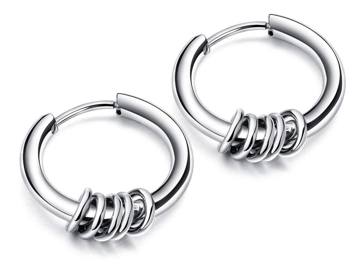 【 人気のピアス 】定番のフープピアスに小さなリングが5つ付属したタイプのピアス。通常のピアスに飽きてしまった方にとてもオススメなアクセサリーです。シンプルなデザインなのでメンズピアス、レディースピアスとしてユニセックスでお使いいただけます。