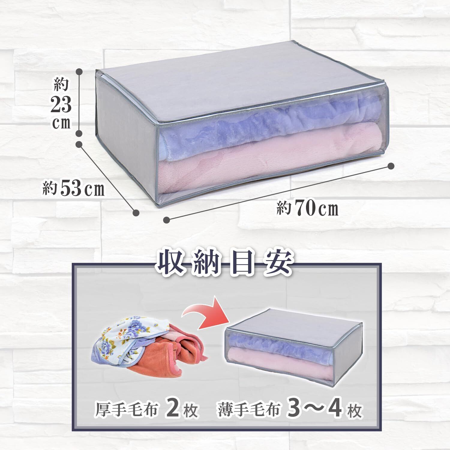 【商品仕様】:サイズ/約幅70×奥行53×高さ23cm、カラー/グレー、内容/2枚、収納目安/厚手毛布なら約2枚、薄手毛布なら約3~4枚、材質/ポリプロピレン、ポリエチレン