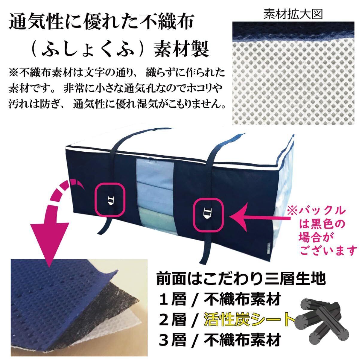 持ち運びなどに便利なベルト2本付き(縫い付けられていないので取り外し可能)引っ越しや押し入れ・クローゼットなどの整理、衣替えなどに!通気性に優れた厚手の不織布(ふしょくふ)素材に活性炭シートを加工。大きく開くファスナーで出し入れもしやすい。