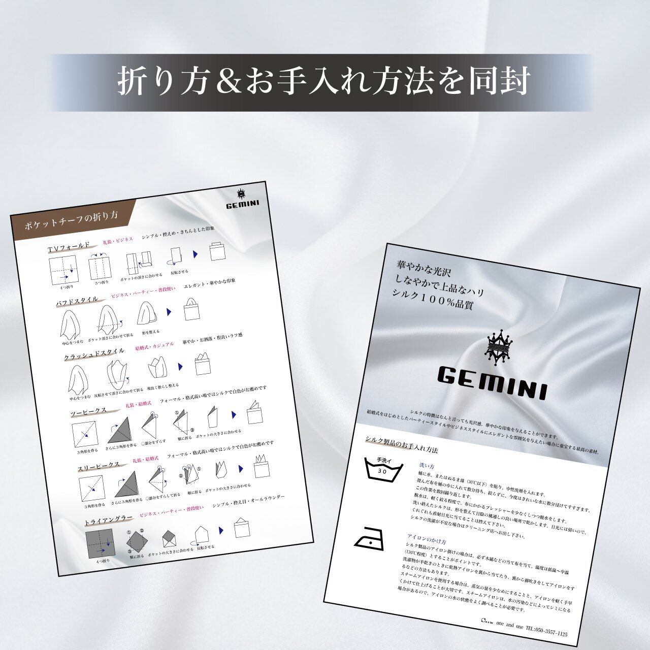 ポケットチーフの折り方と、デリケートなシルクの扱い方のリーフレットをプレゼント!TPOにあわせて織り方を変えるだけで違った印象に!