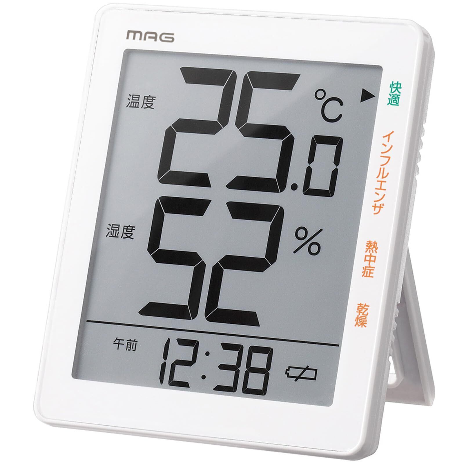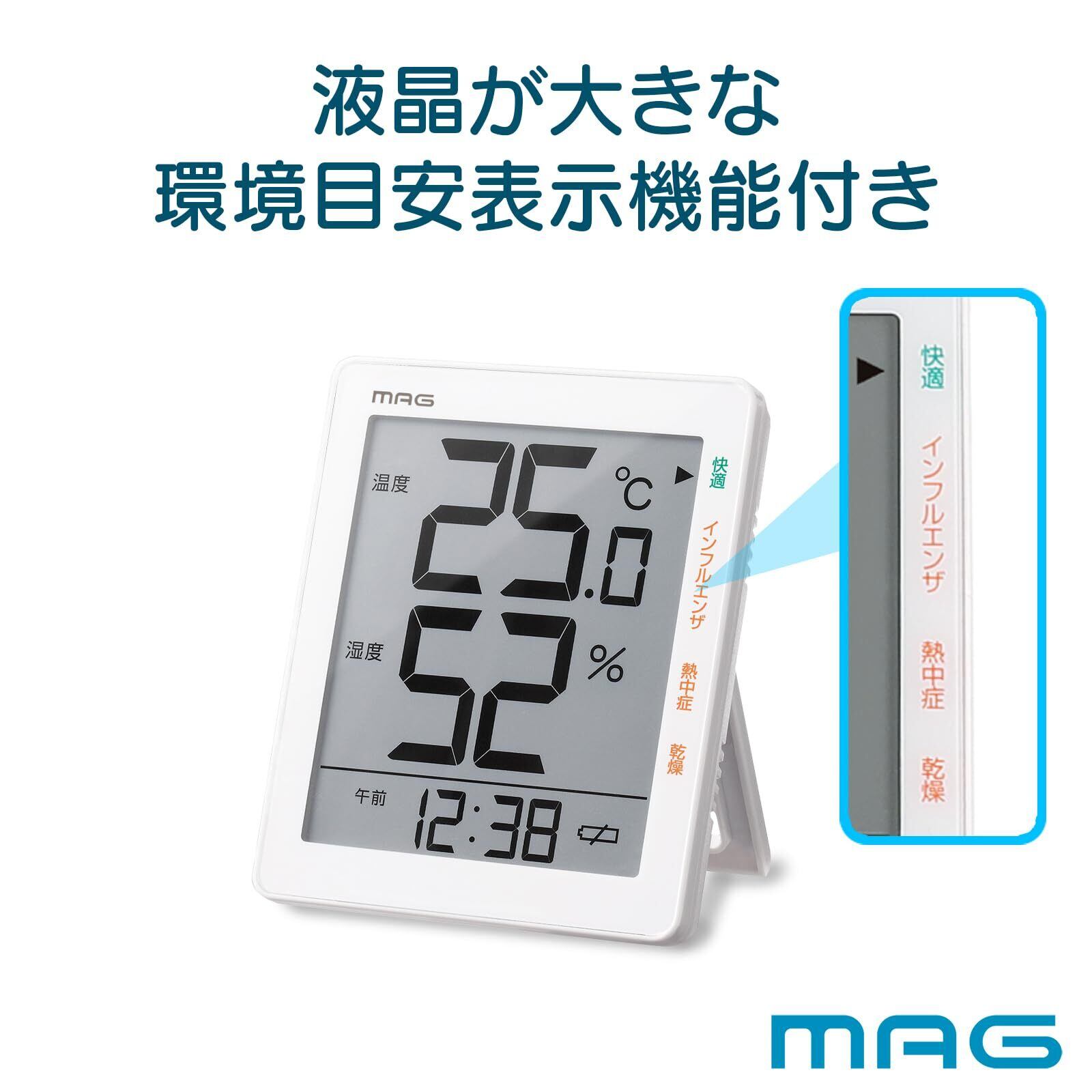 MAG(マグ) 温度計 湿度計 温度湿度計 デジタル 環境目安表示 熱中症 インフルエンザ 乾燥 快適 時計表示 大型 大きい 置き掛け兼用 ホワイト TH-105 WH ノア精密