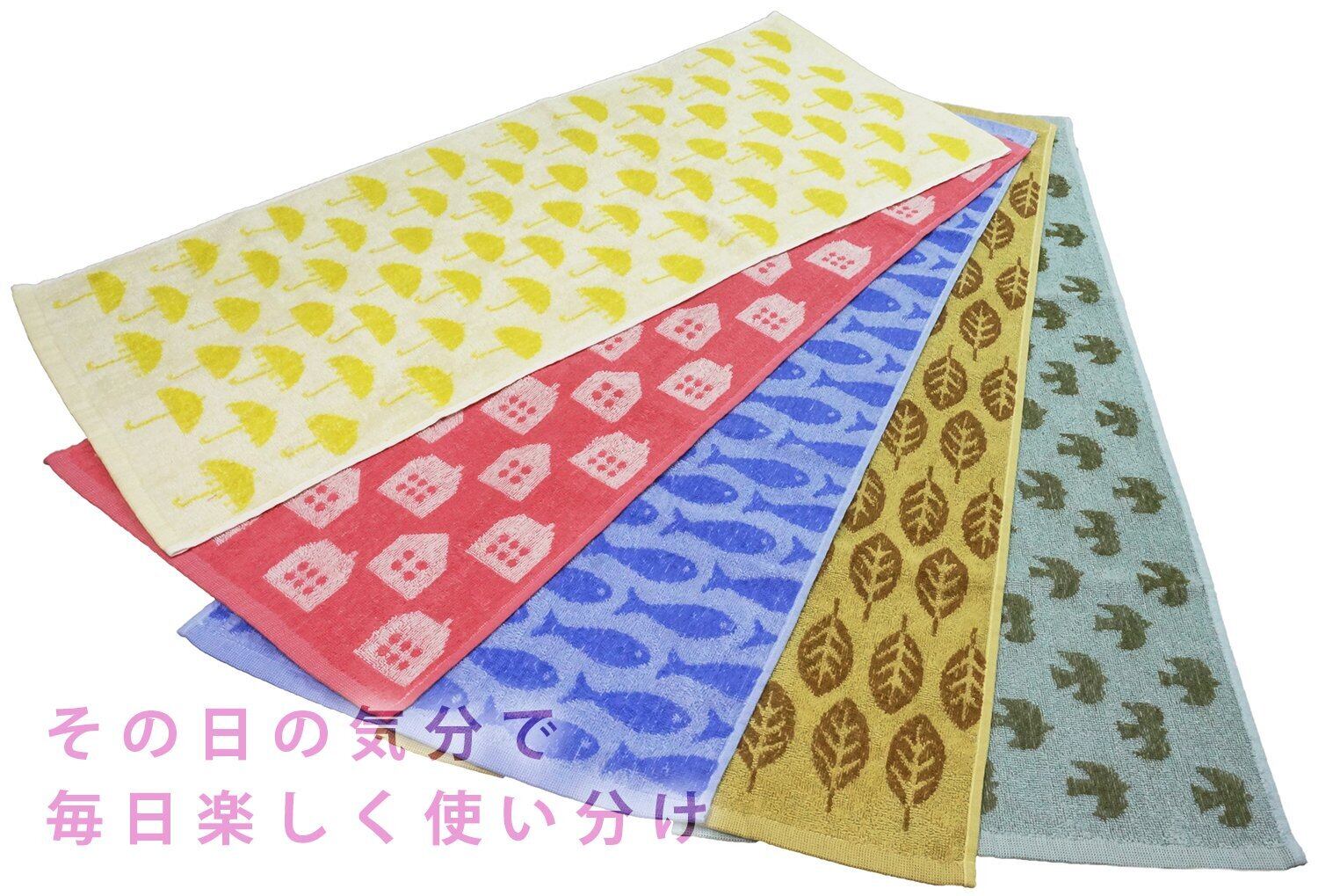 Kosugizen フェイスタオル まいにち北欧ライフ 5色(5柄)各1枚入 34×80㎝ 北欧風モチーフ 乾きやすい薄手タイプ 5枚セット SV-2306