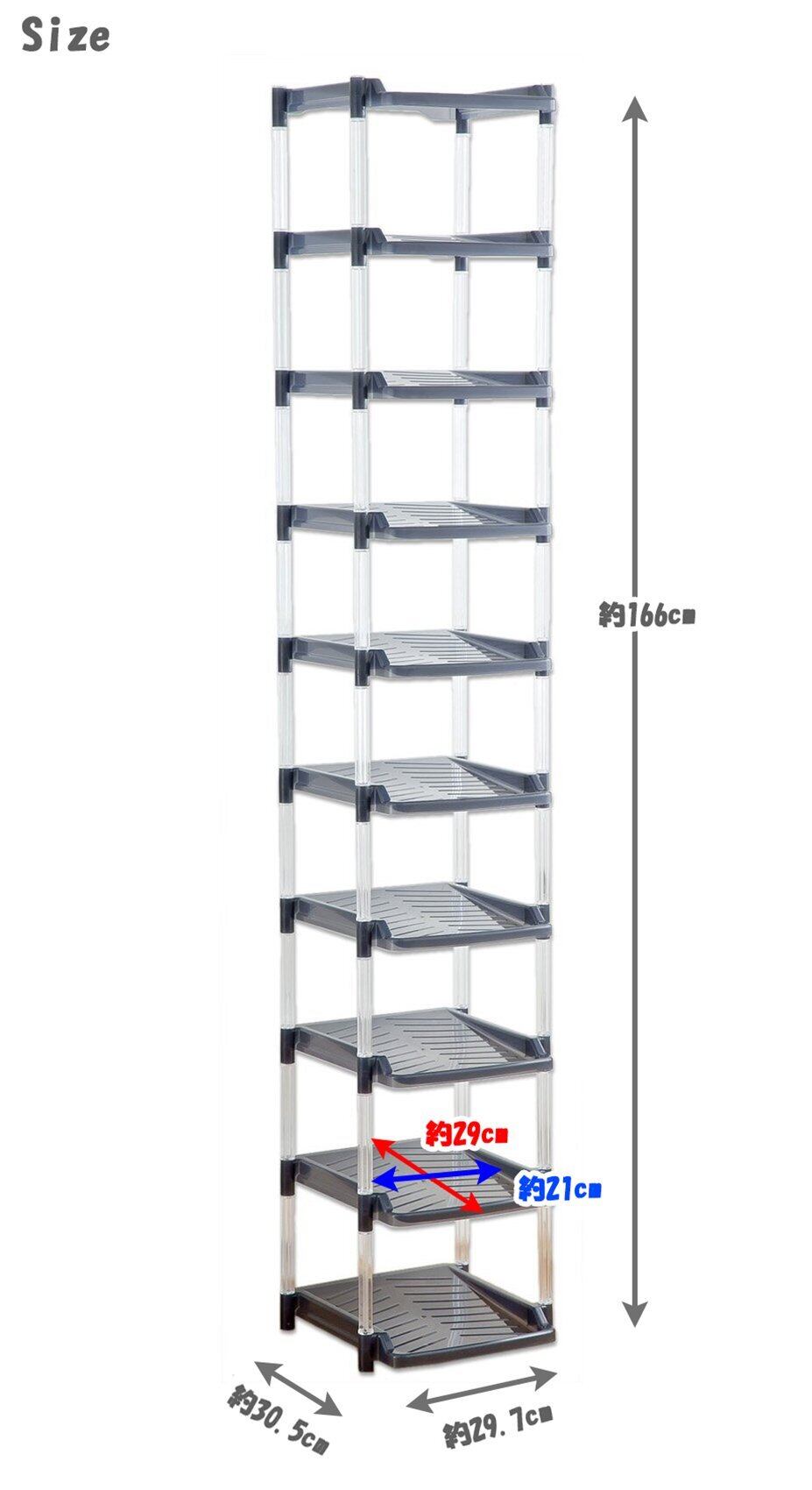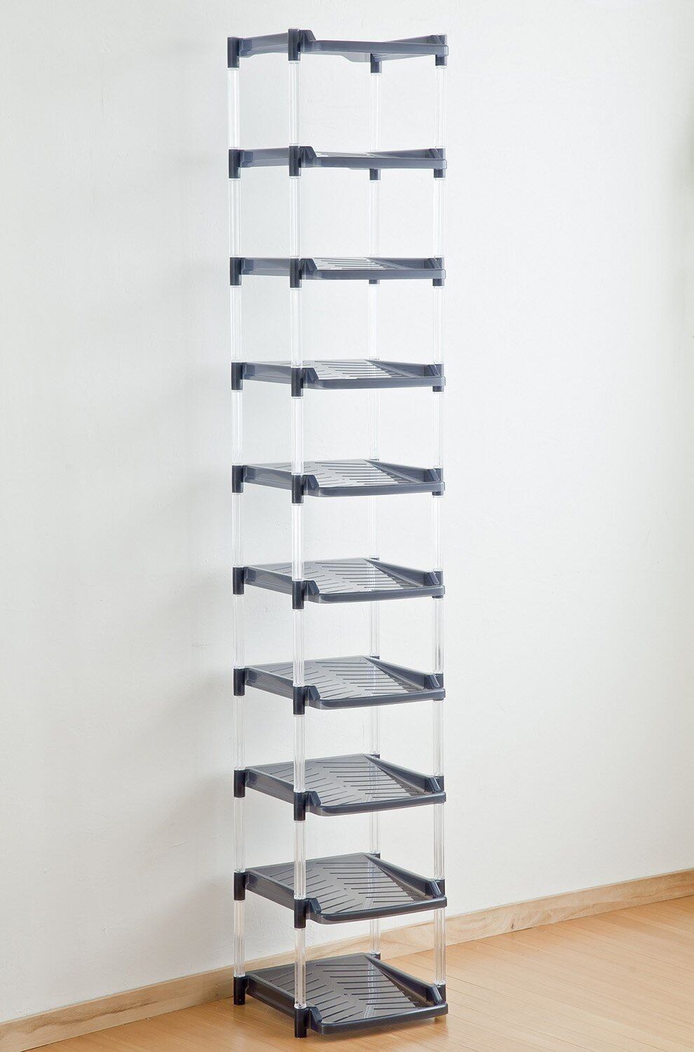 ●たっぷり収納できる10段タイプのシューズラック ●約30cm四方あれば最大10足分が収納できるスリムなタワー型 ●狭いスペースでも設置でき、圧迫感がないのが嬉しい ●2段に分けて組み立てると、お子様でも手の届く高さにおさまる ●お気に入りの靴を並べて、コレクションのように見せる収納にもオススメ ●雑然としがちな玄関が整理整頓されてスッキリ! ●見やすく取り出しやすいので、忙しい朝の身支度もスムーズ。 ●シンプルで機能的なデザイン ●インテリアになじむグレーとブラウンの2色展開