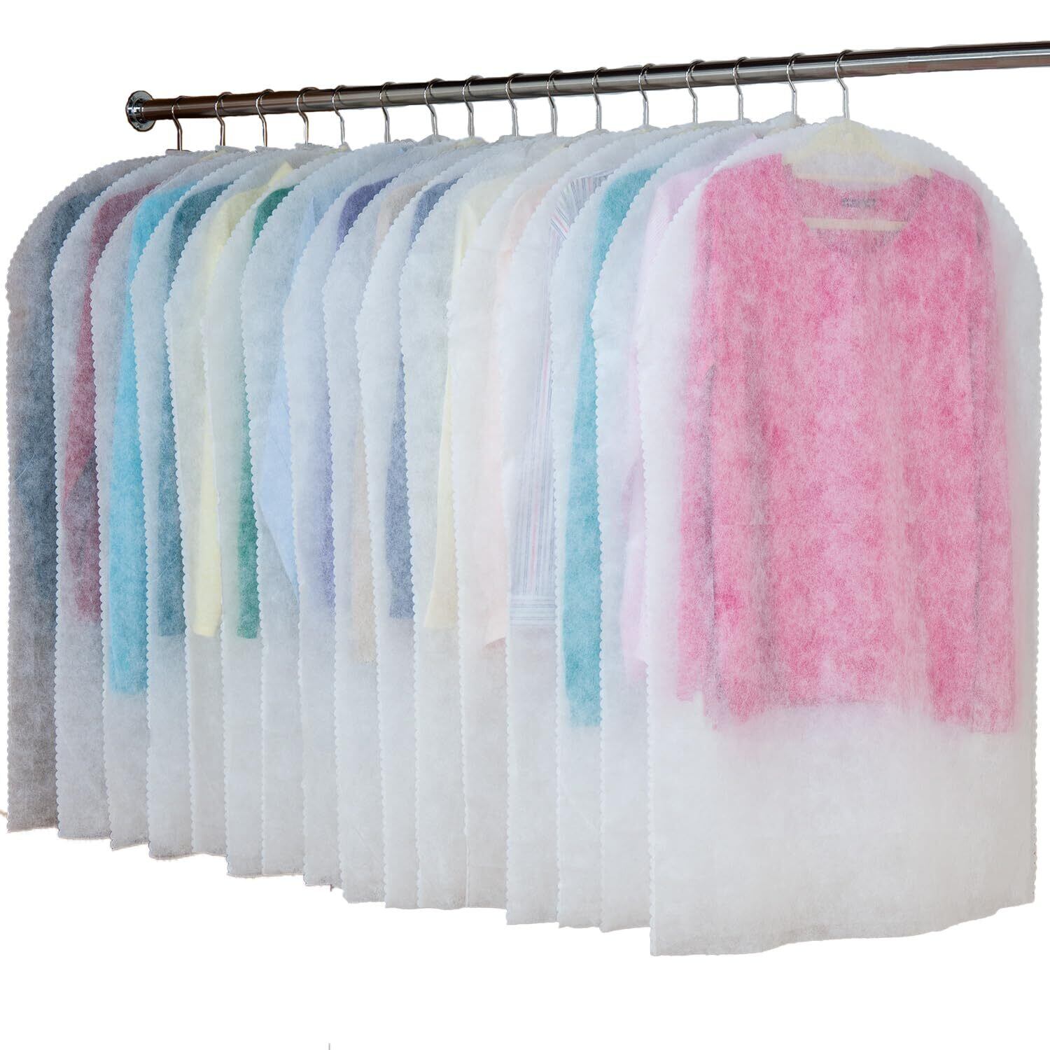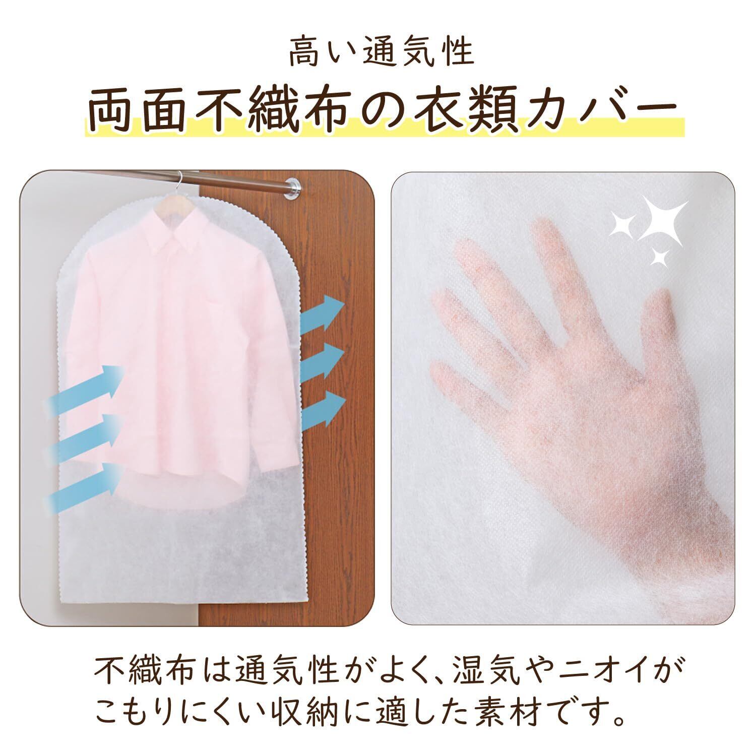 【通気性の良い不織布製ショートサイズ衣類カバー】:通気性が良く湿気やにおいのこもりにくい、ショートサイズの不織布製衣類カバー。